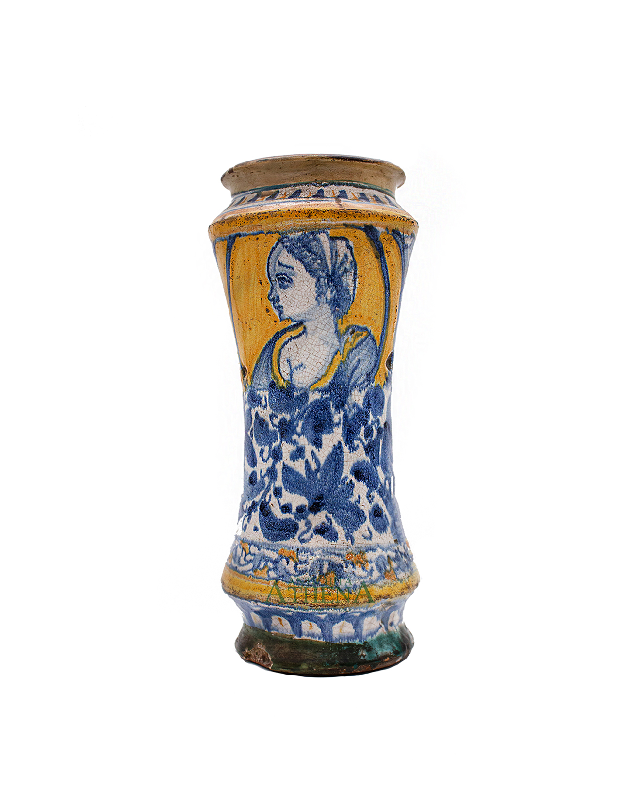 Albarello in maiolica policroma decorato da figura femminile entro medaglione su parte superiore del recto e fiori e foglie blu su fondo bianco su parte inferiore del recto e verso.
