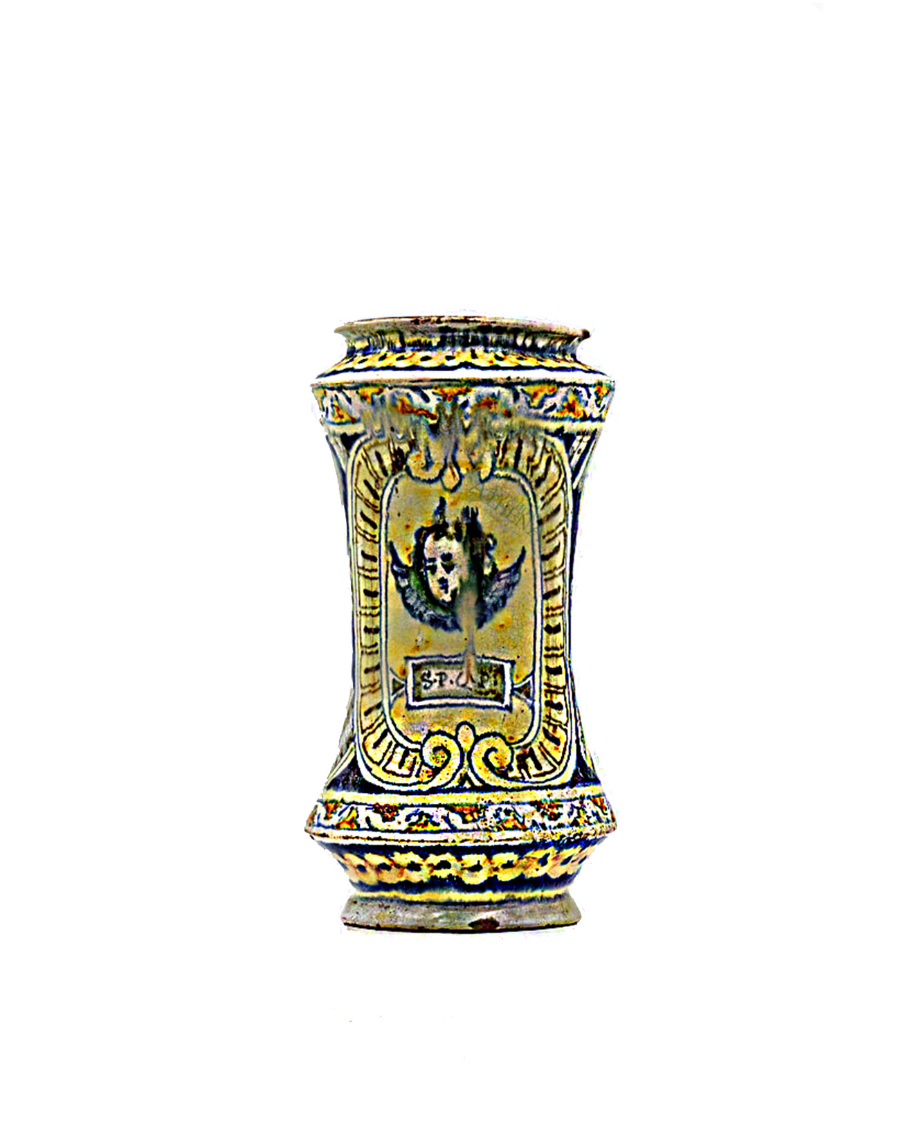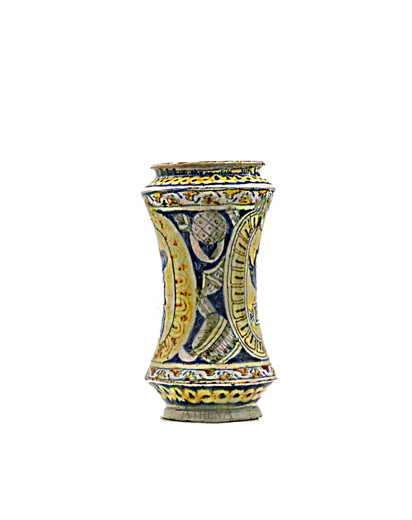 Albarello in maiolica policroma con figura di uomo entro un medaglione su recto e figura di cherubino con targa entro medaglione su verso. Spazi vuoti riempiti con scudi e trofei interposti su fondo blu. Probabile l’appartenenza del vaso alla “speziera del Cherubino”.