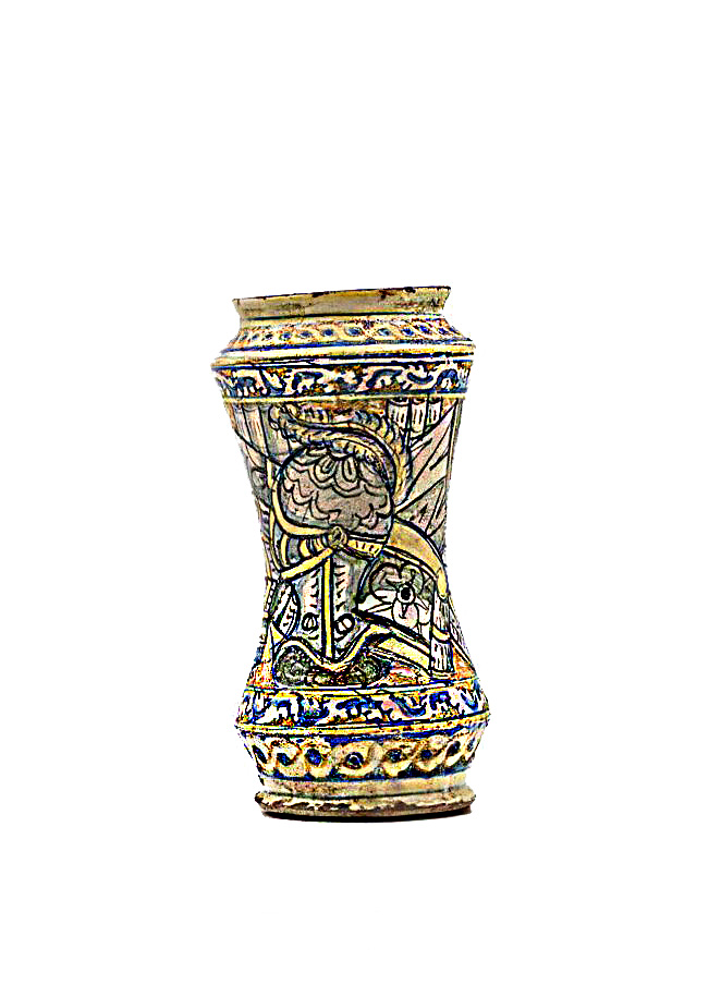 Albarello in maiolica policroma con immagine di Sant’Antonio entro medaglione su recto. Su verso, tra gli scudi e i trofei, appare anche un quadrifoglio, segno distintivo delle realizzazioni del decoratore Filippo Passalacqua.