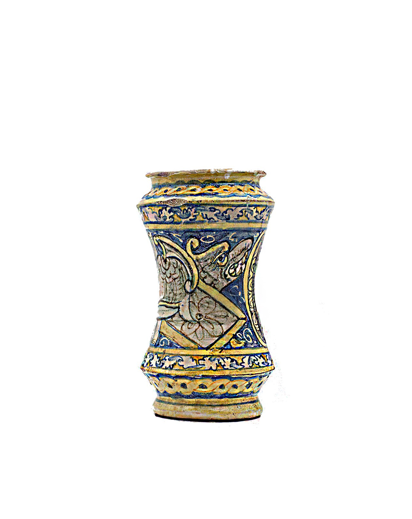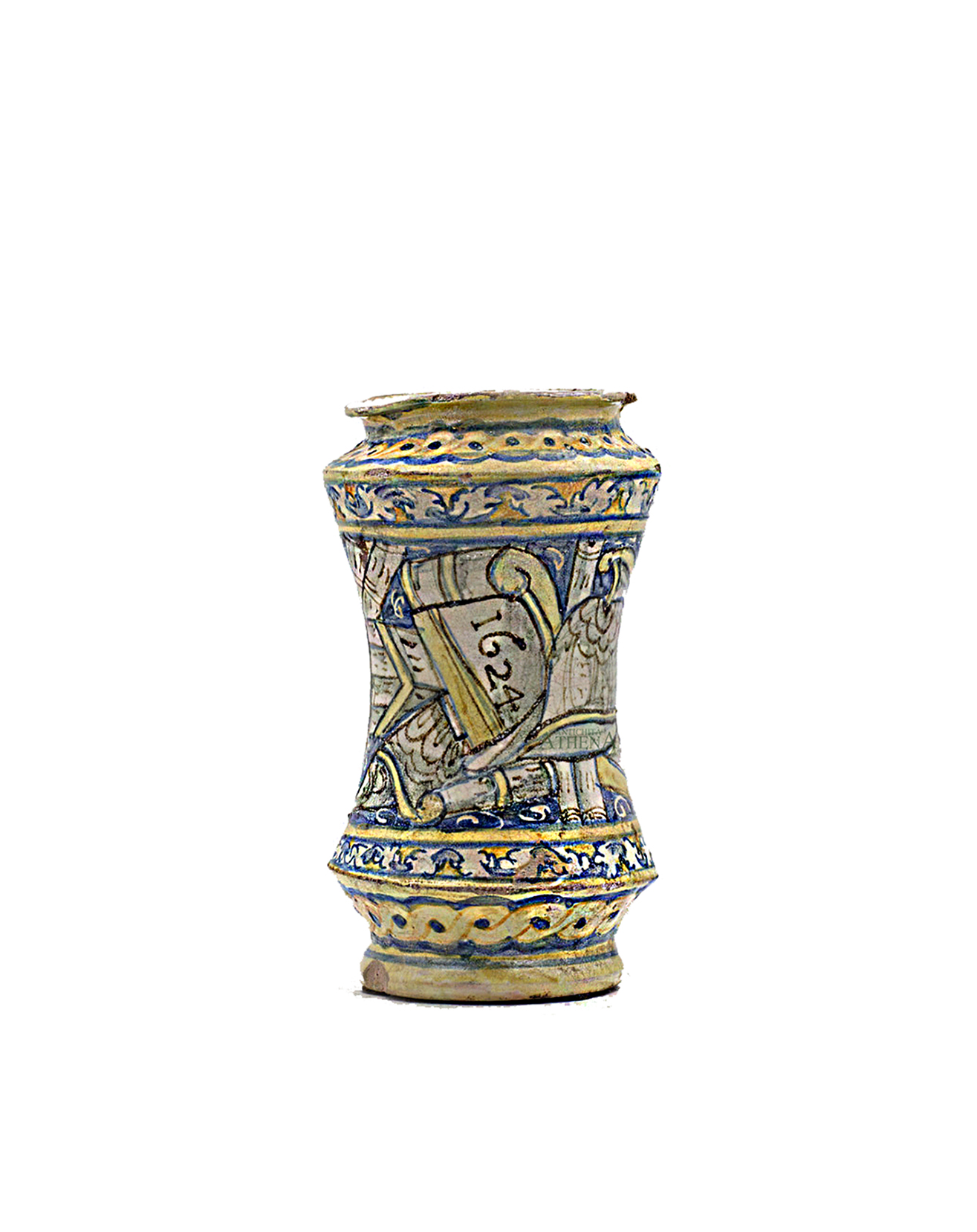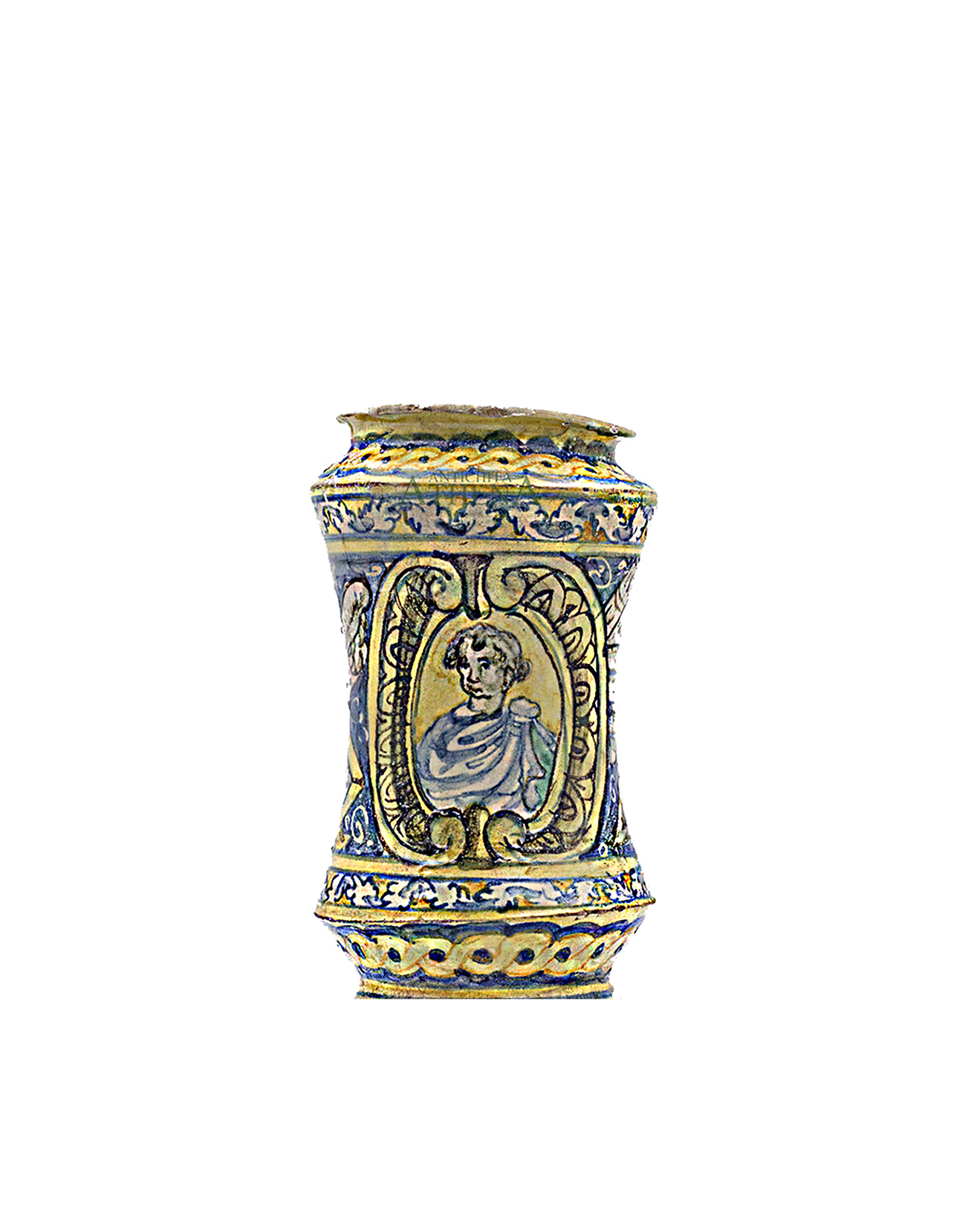 Albarello in maiolica policroma con figura togata (“ritratto di stato”) entro medaglione su recto. Su verso il quadrifoglio simbolo-firma di Filippo Passalacqua, con figura di lupo che grugnisce.