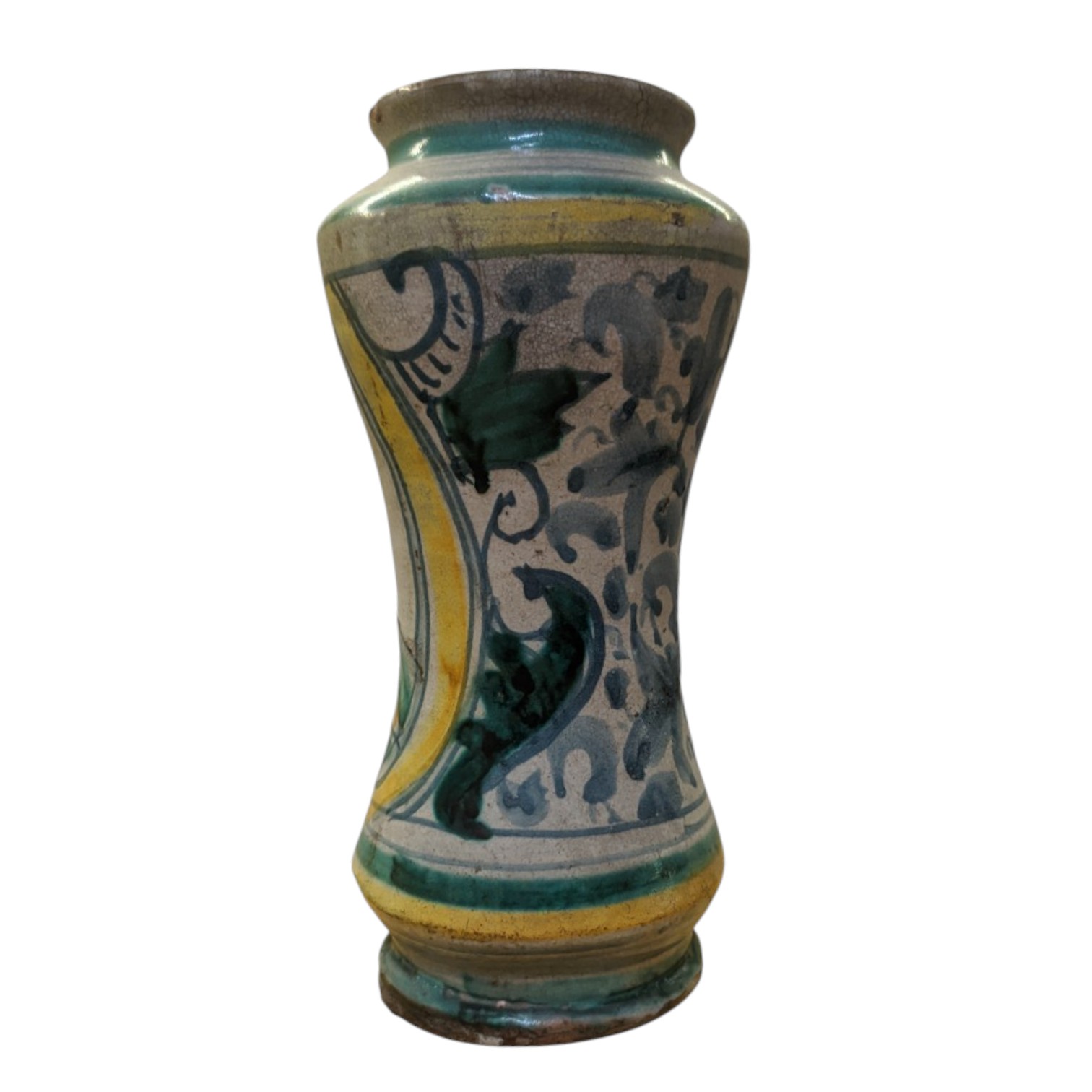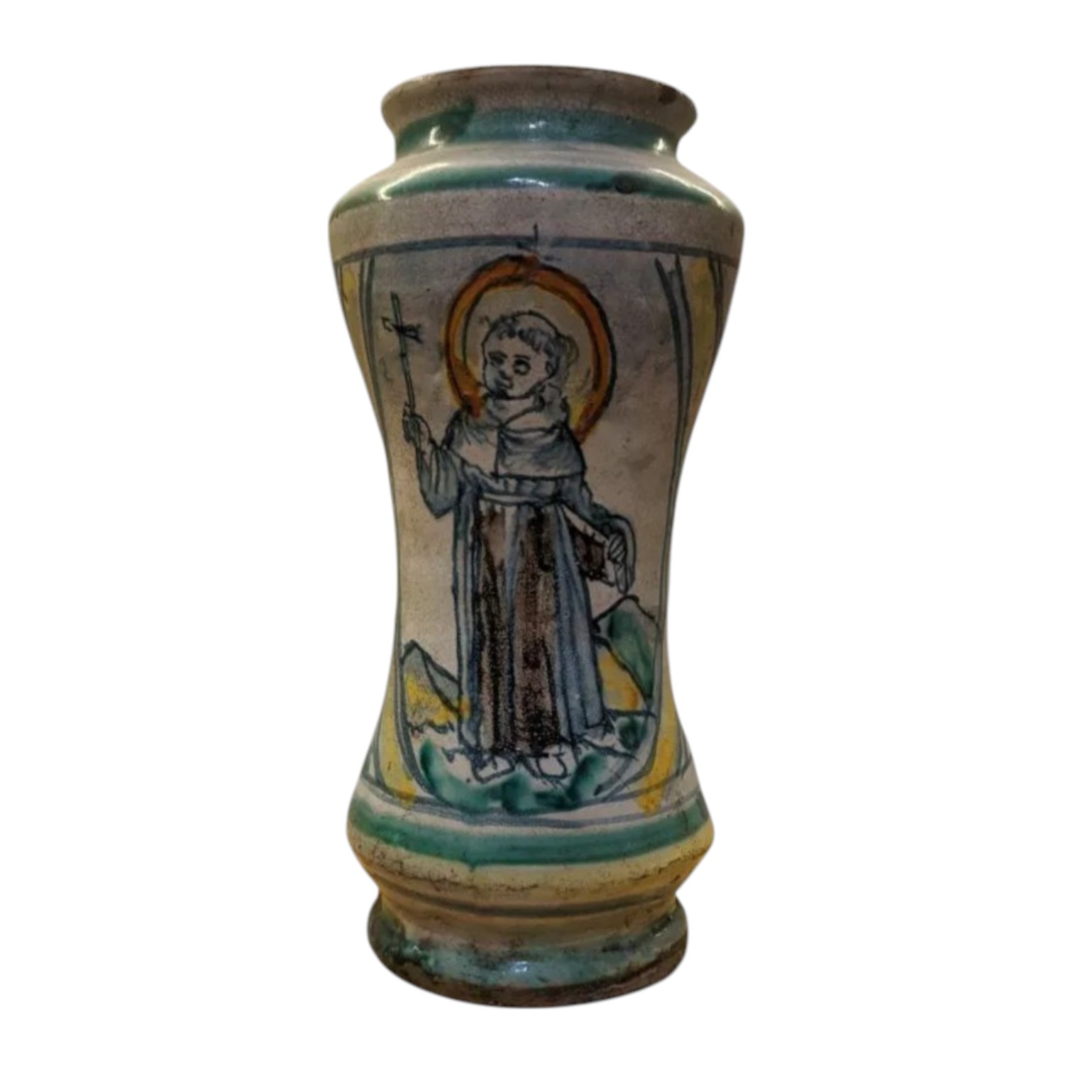 Albarello in maiolica policroma decorata a Sciacca, raffigurante sul verso frate entro medaglione e sul recto decorazioni vegetali verde-blu su fondo bianco.