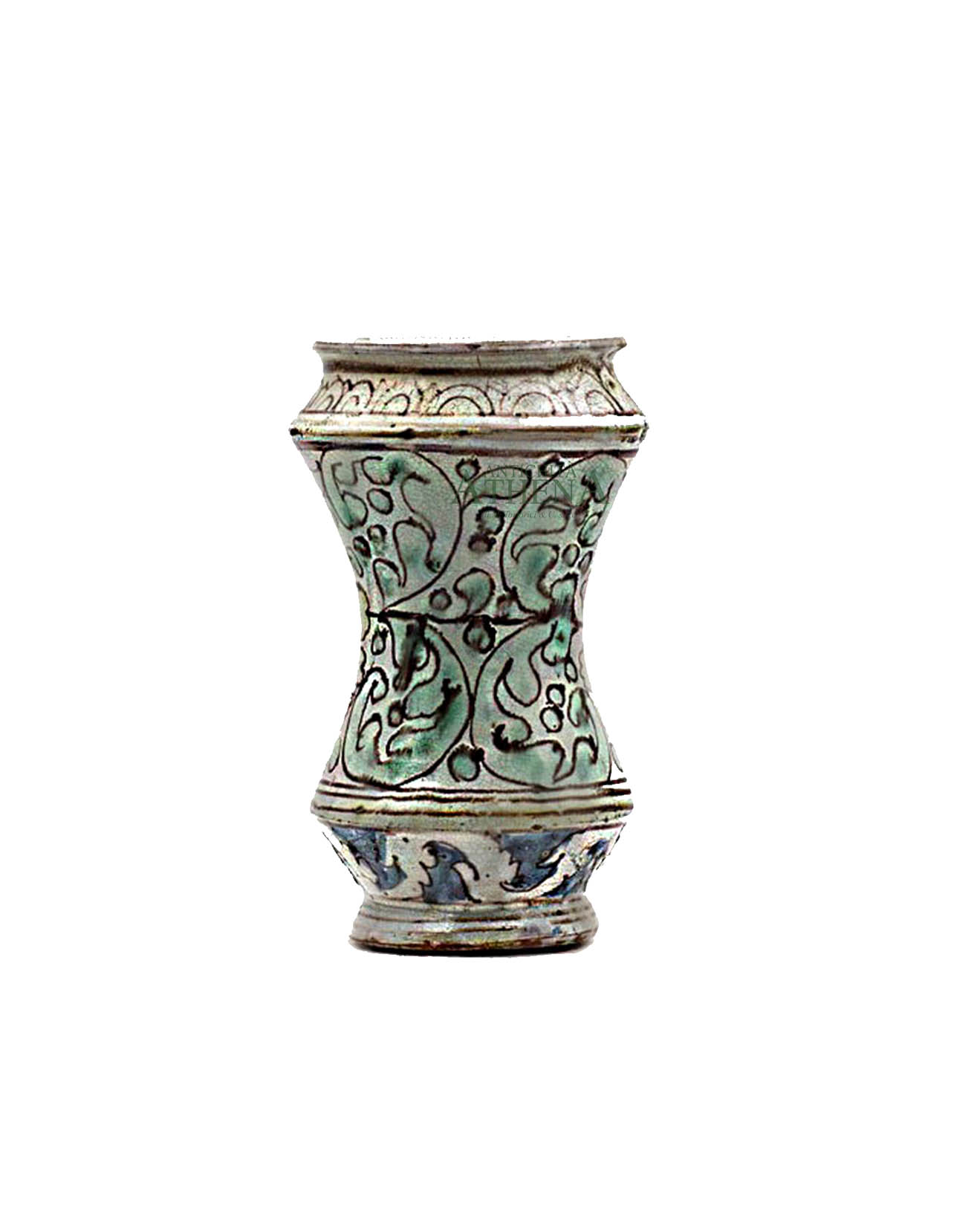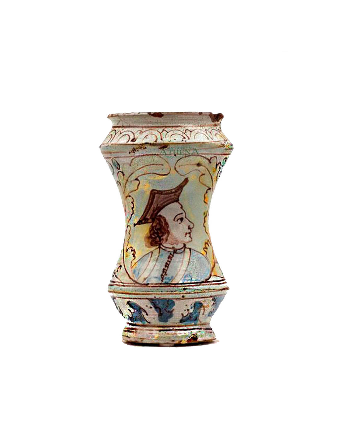 Albarello in maiolica policroma con figura di religioso entro medaglione con motivo di foglie, su recto. Apparato decorativo burgitano su verso.