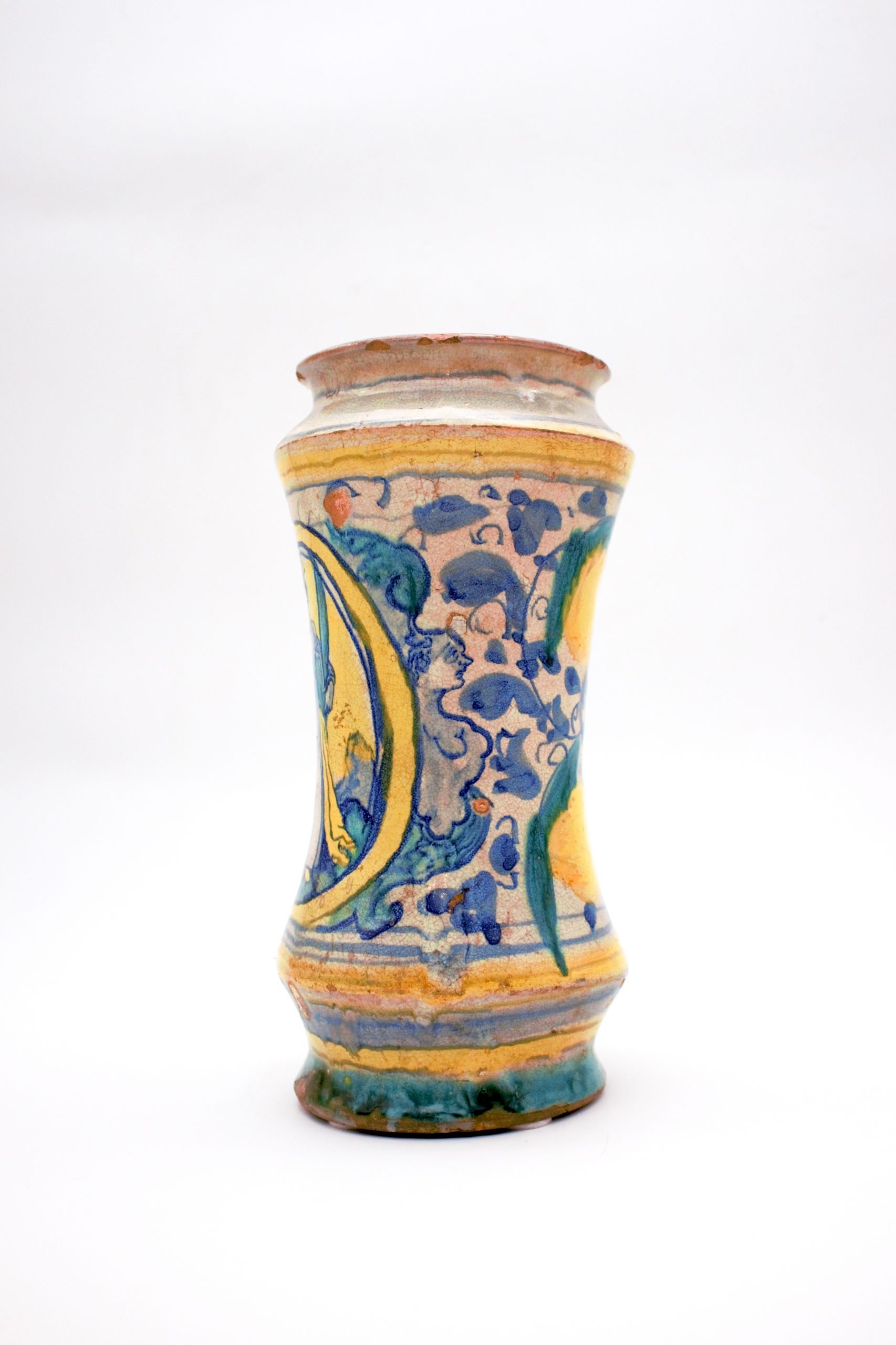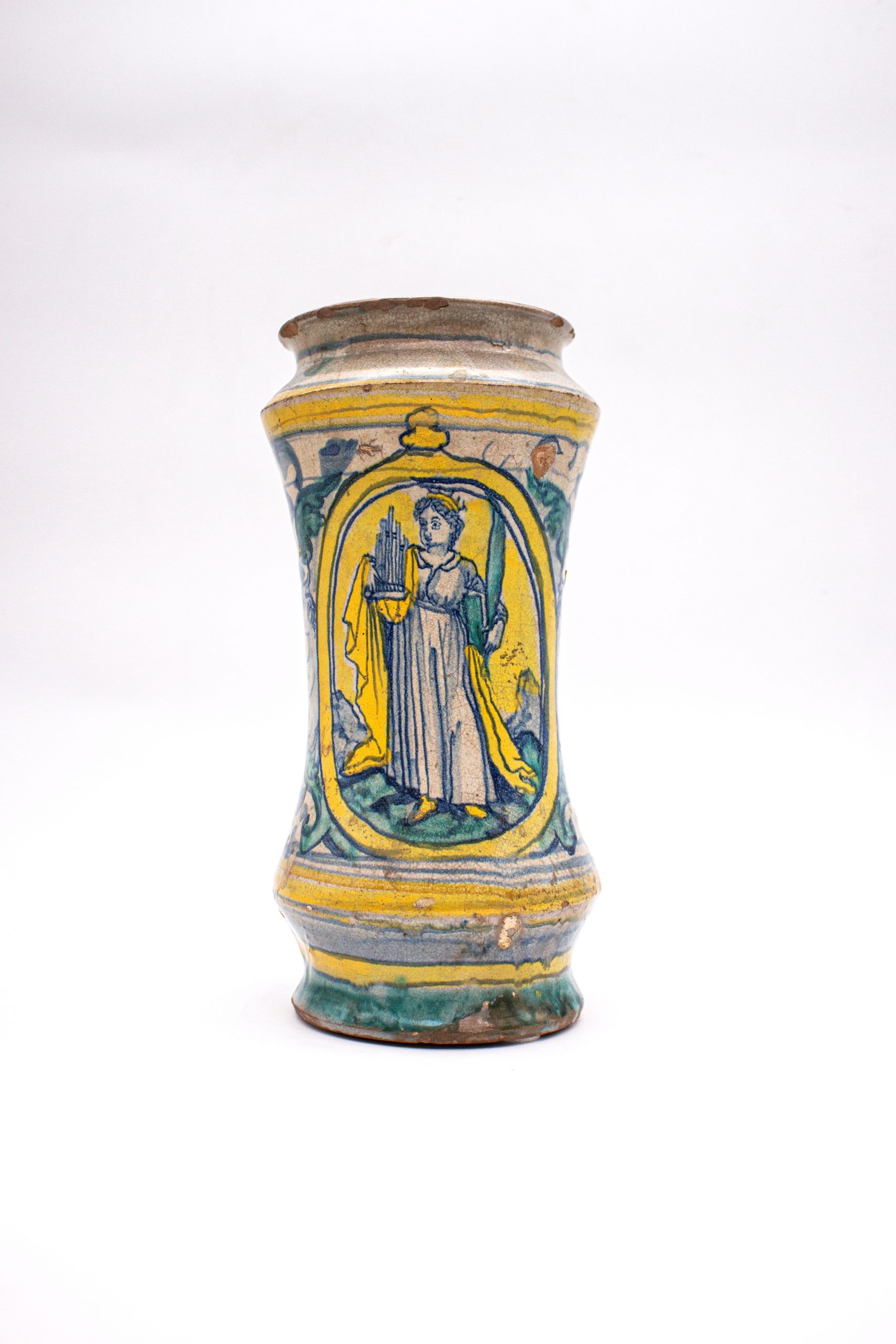 Albarello in maiolica policroma decorato su recto con figura di Santa Cecilia.
