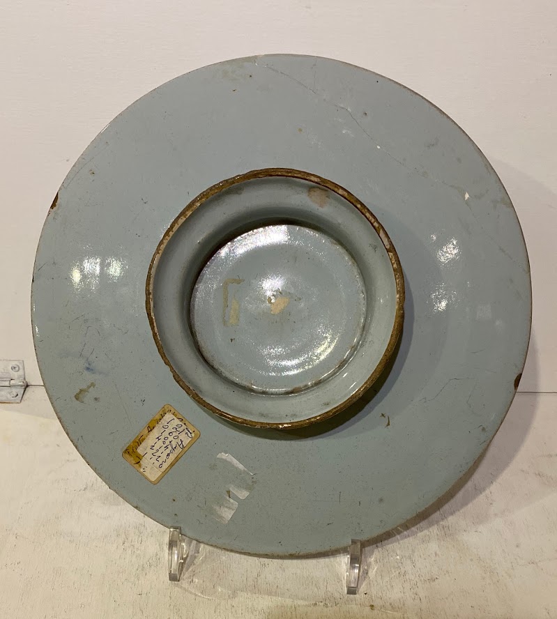 Alzata in maiolica decorata in bicromia da una costruzione entro paesaggio