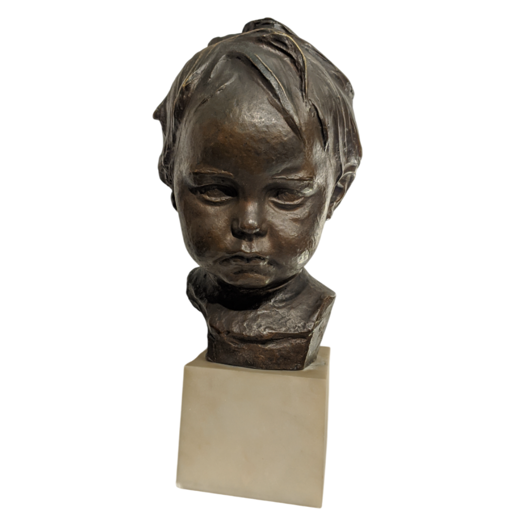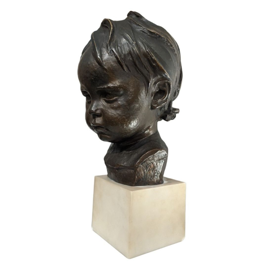 Bronzetto raffigurante testa di bambino con base marmo.