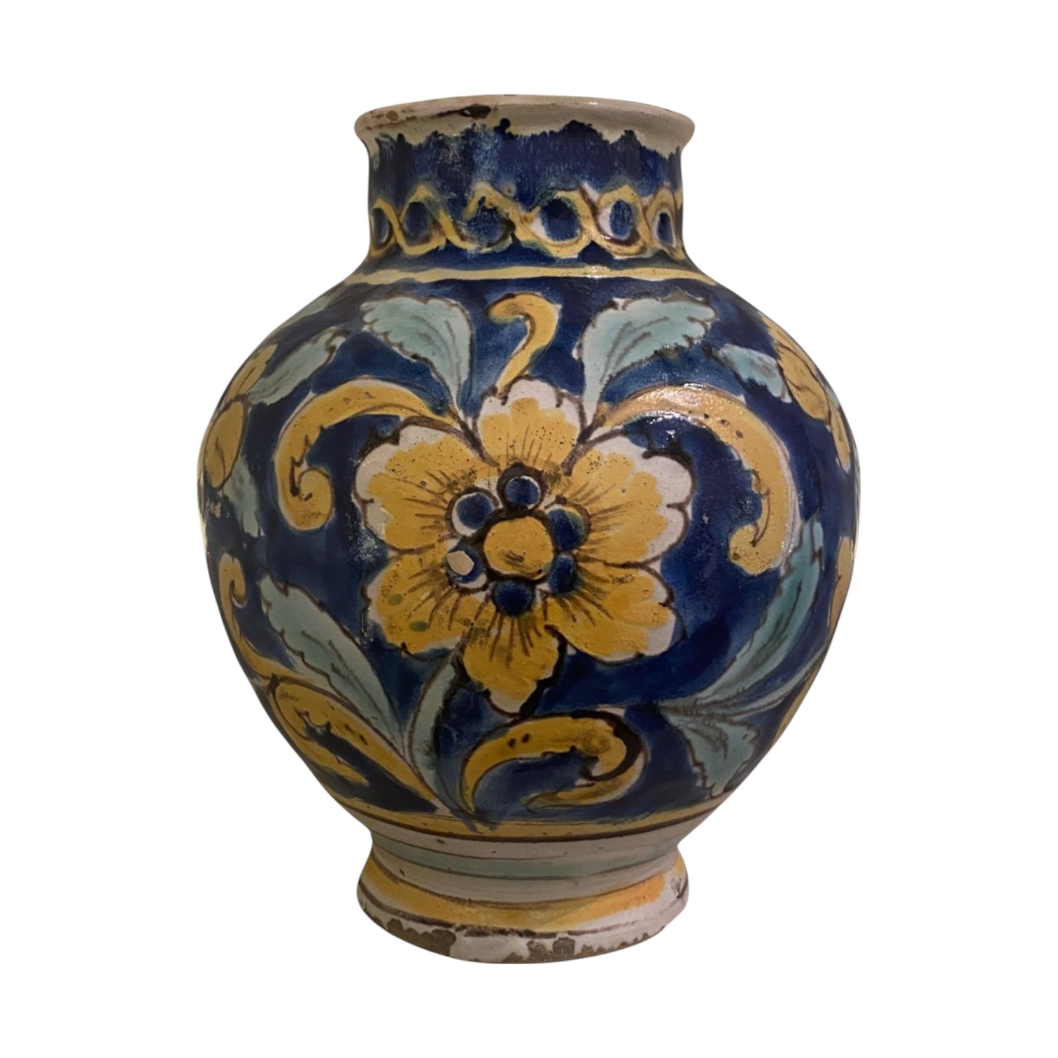 Boccia di Caltagirone di manifattura Lo Nobile con decorazioni a fiori e fogliami gialli su sfondo blu.