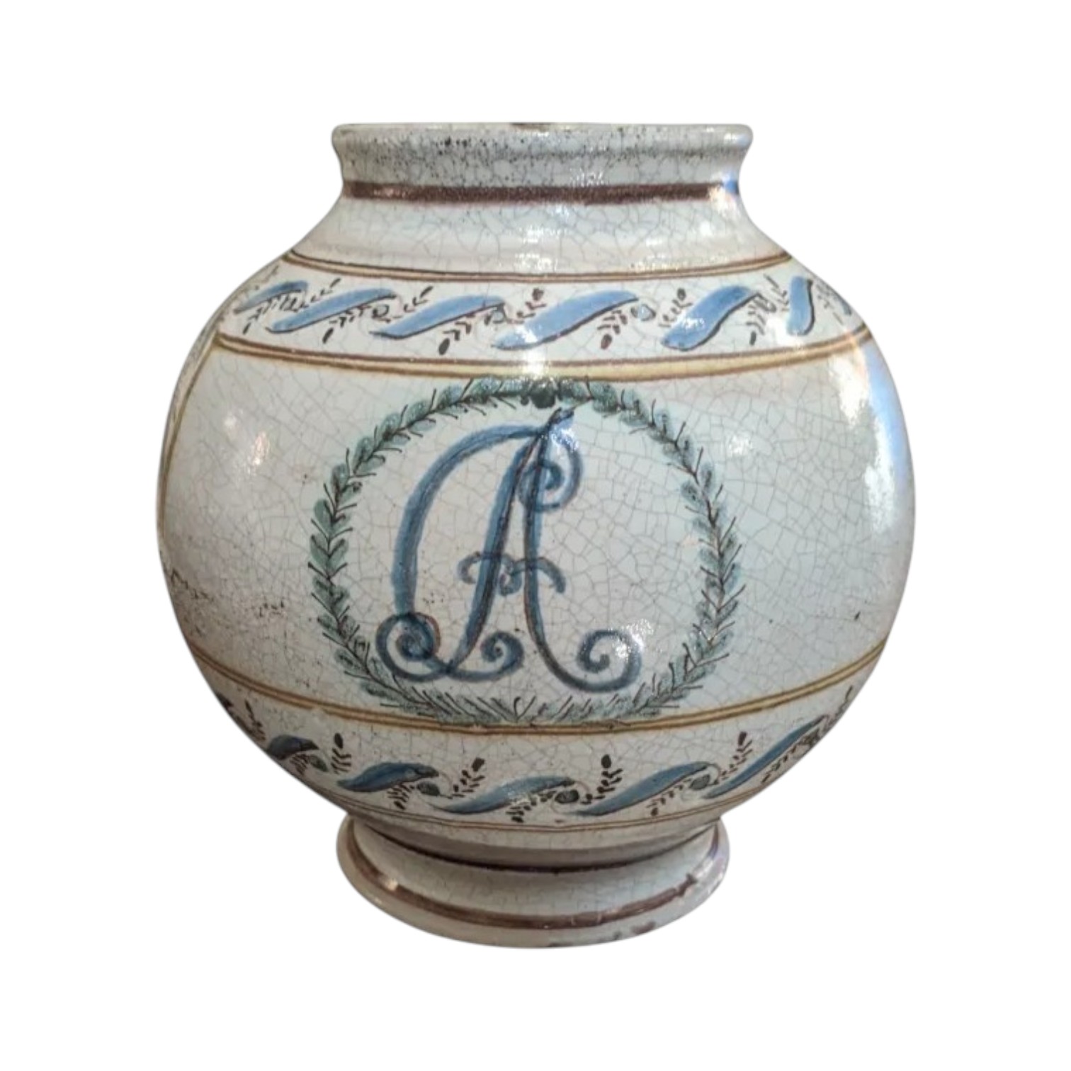Boccia in maiolica policroma, fabbrica nuova di Giuseppe Malvica decorata a motivi vegetali e con medagliane con monogramma CA.