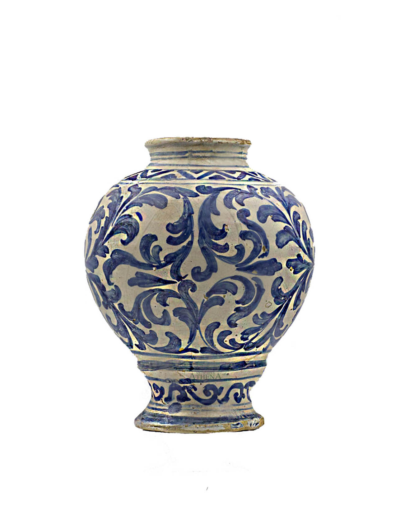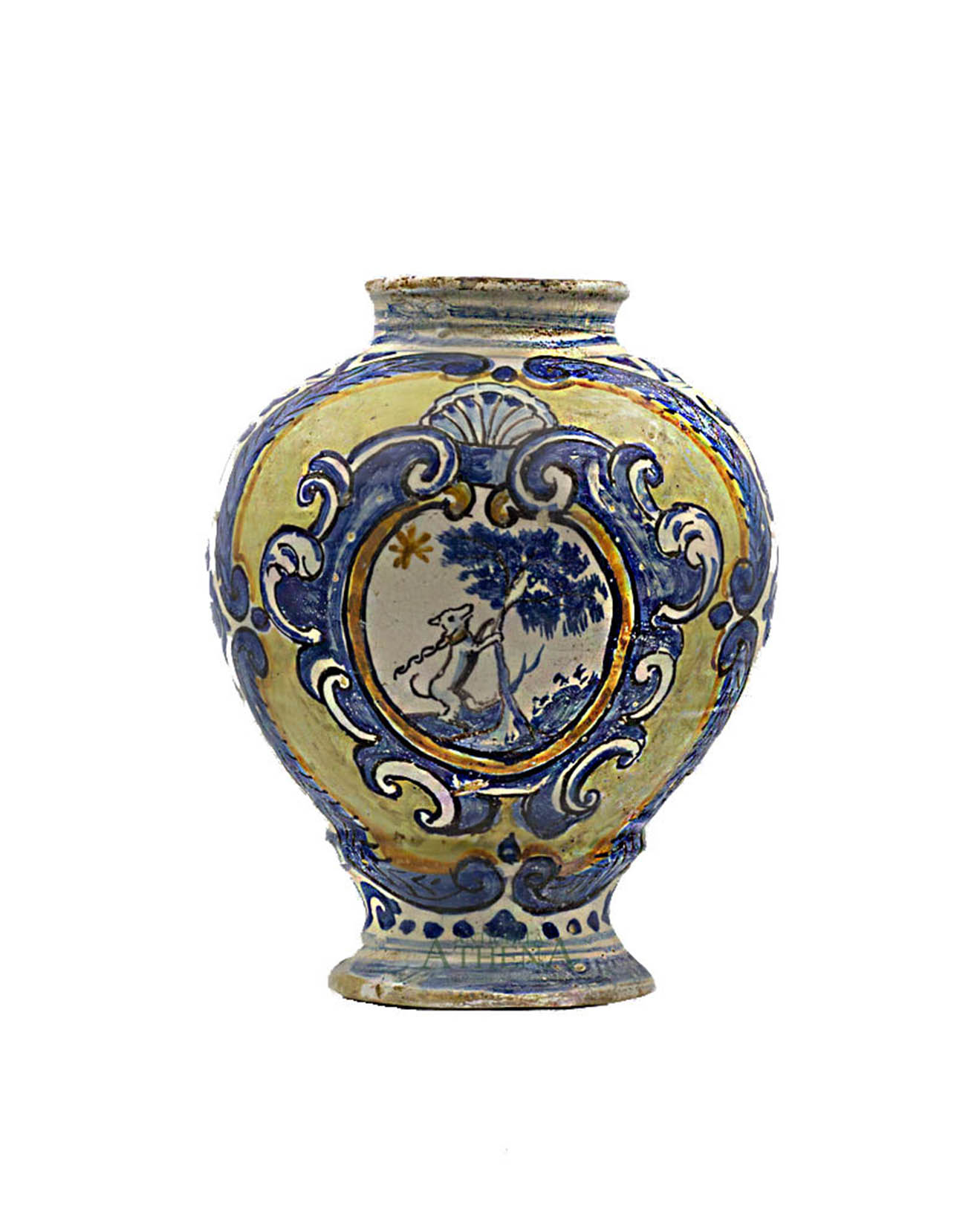 Boccia in maiolica policroma con stemma nobiliare, o insegna da speziera, con cagnolino in luogo esterno entro il medaglione su recto. Motivi floreali blu su fondo bianco sul verso.
