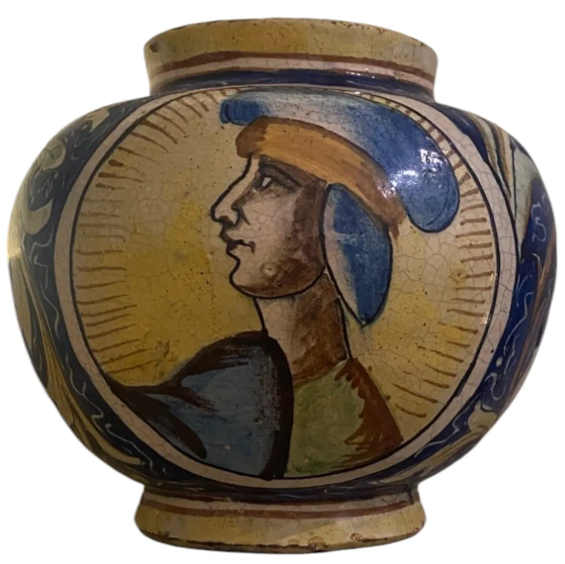 Boccia in maiolica di Caltagirone di Manifattura Celestino di Bartolo con medaglione centrale raffigurante guerriero e decorazioni a fogliami su sfondo blu.