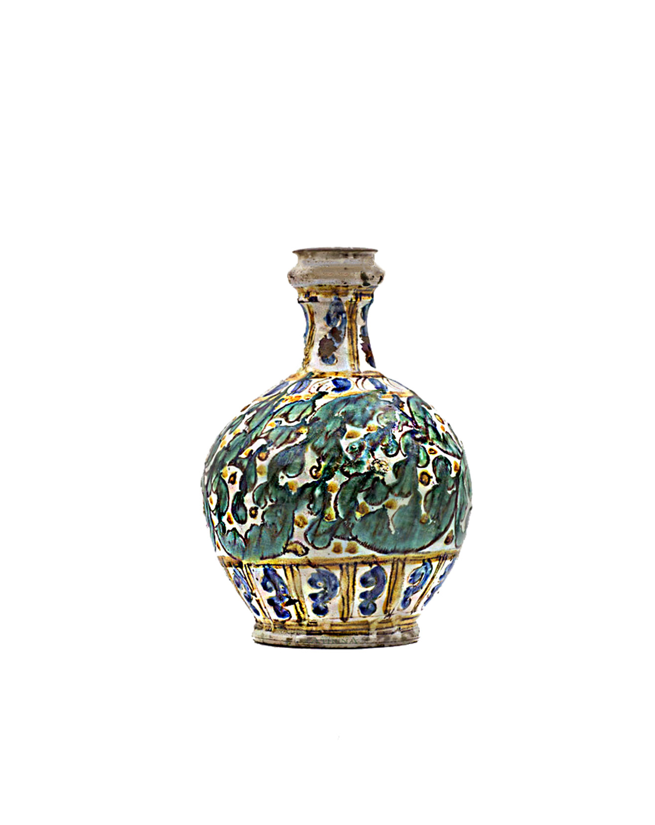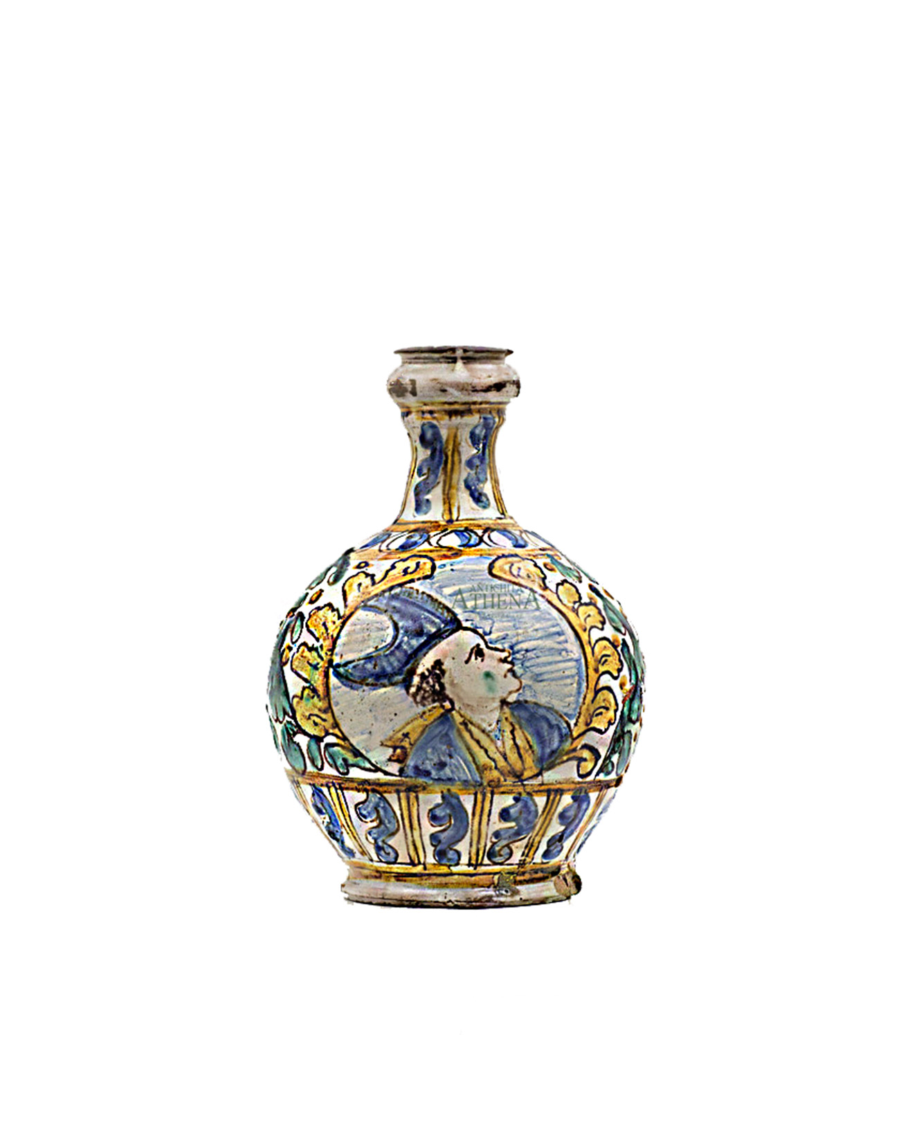 Bottiglia in maiolica policroma con soggetto maschile in ampio medaglione su recto e, decorata con motivo fitomorfico affastellato, verde su fondo bianco, sul verso.