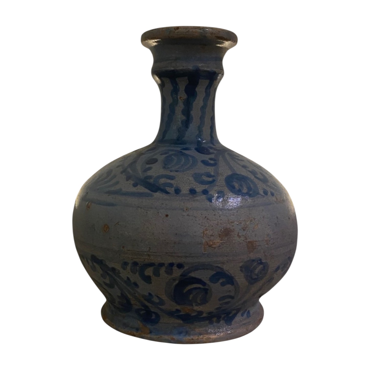 Bottiglia in maiolica di Caltagirone fondo bianco dipinta a motivi floreali e merletti in blu.