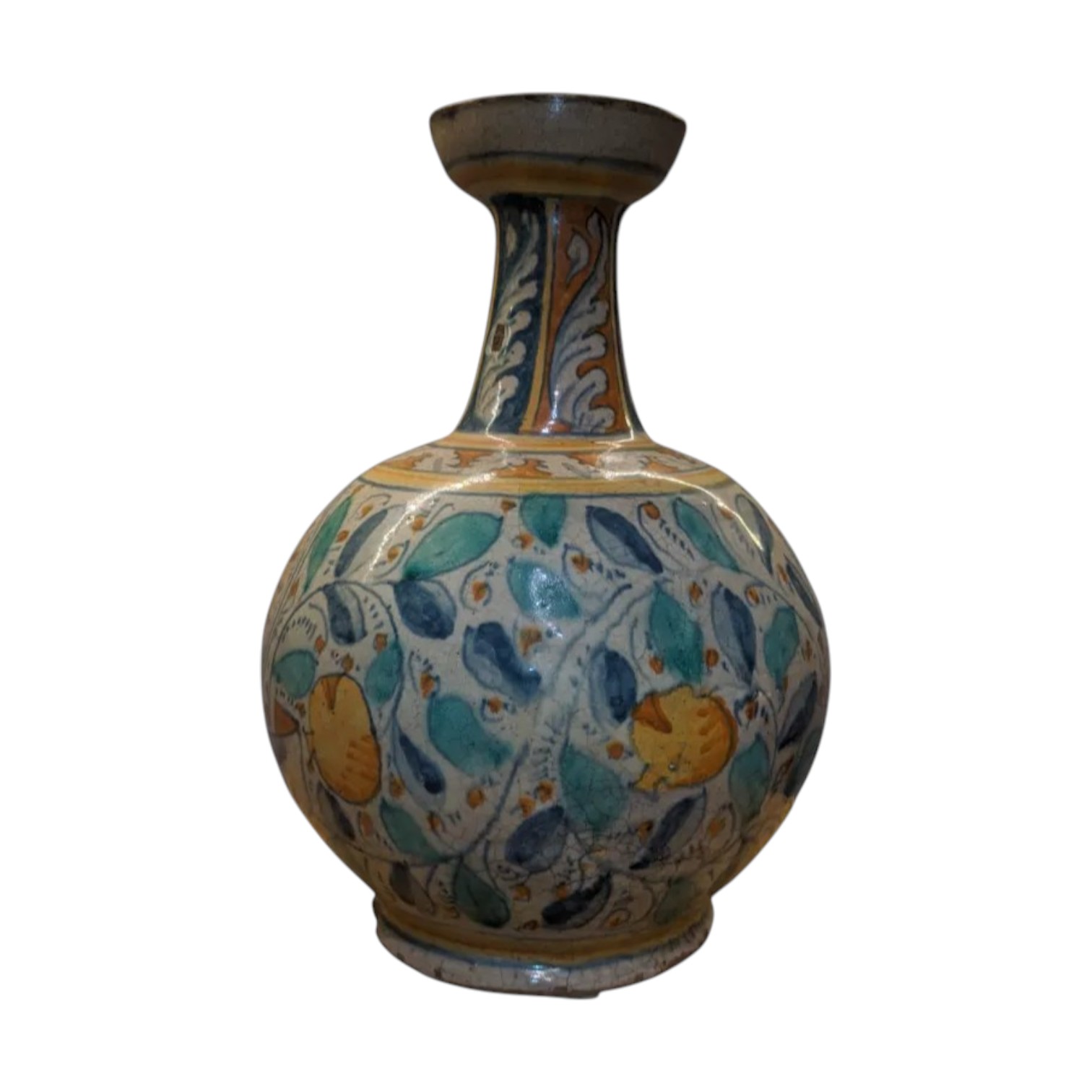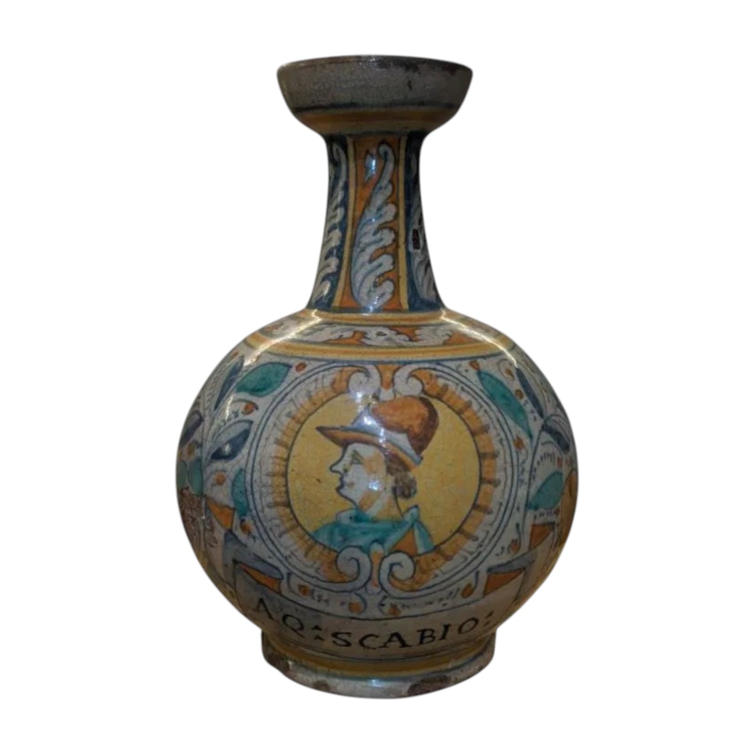 Bottiglia in maiolica decorata a Sciacca, raffigurante sul verso un uomo con cappello entro medaglione e sul recto decorazioni a foglie e limoni.