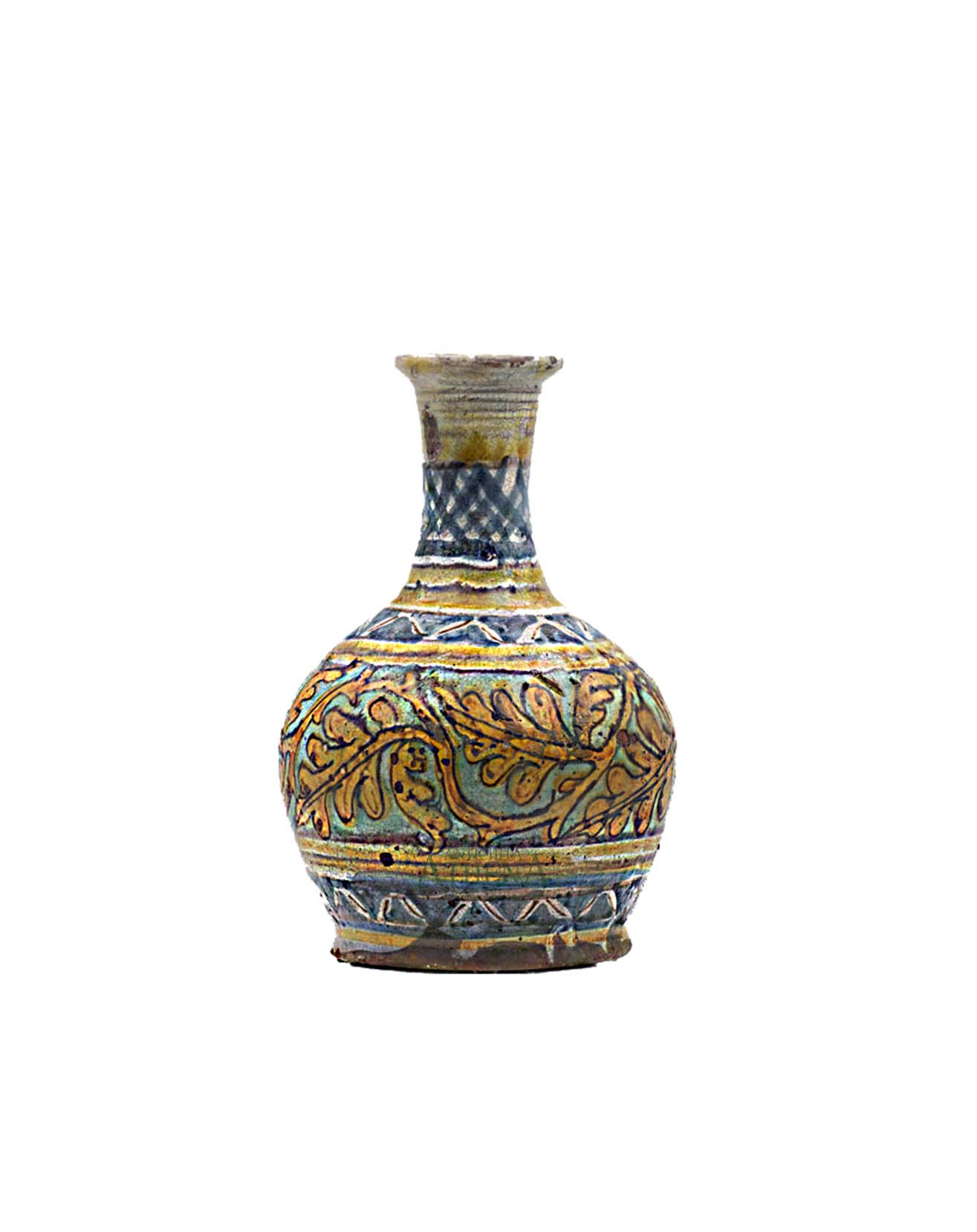 Bottiglia in maiolica policroma con decoro a fasce orizzontali costituite da prevalente motivo a foglie ricorrenti e da elementi derivati da antiche ornamentazioni fittili. Graticcio al collo.