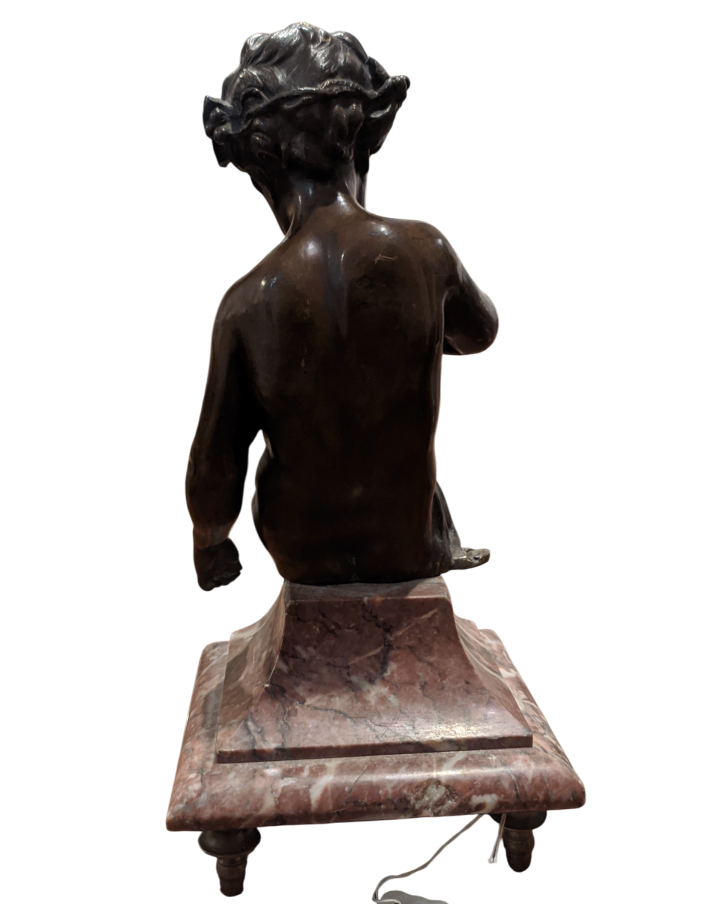 Scultura in bronzo raffigurante bambino seduto su base in marmo rosso.
