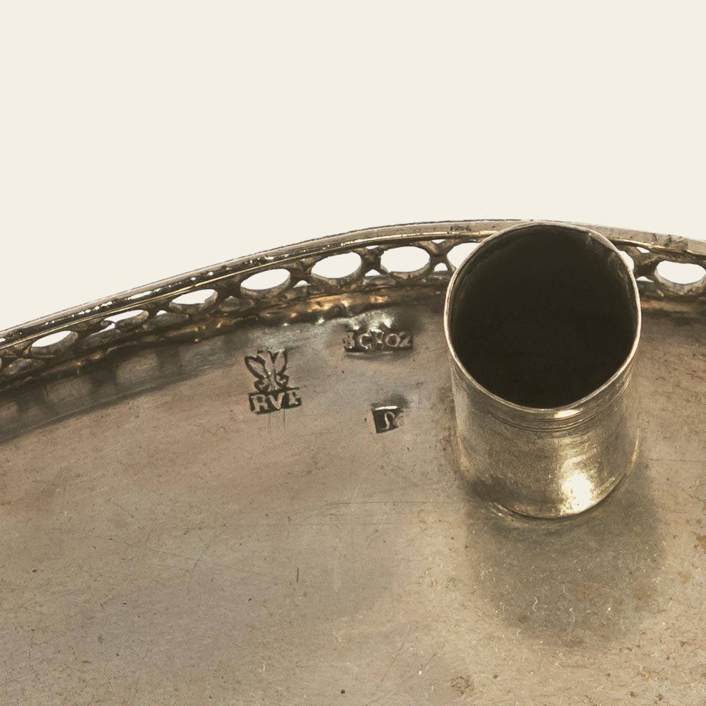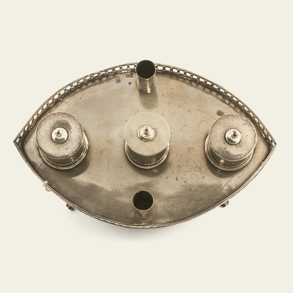Raro calamaio in argento con piedini piramidali e ringhiera tipicamente di linea neoclassica.