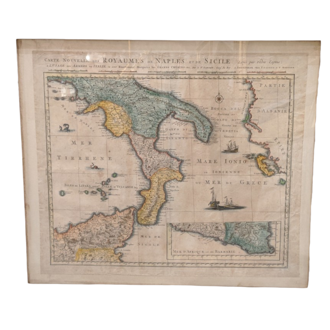 Mappa storica intitolata Carte nouvelle des Royaumes de Naples, et de Sicile, realizzata da Covens e Mortier nel 1742. Pubblicata all’interno di un atlante della celebre casa olandese, raffigura con grande precisione i Regni di Napoli e di Sicilia. L’incisione, arricchita da una coloritura a mano nei toni del blu, giallo e rosso, offre dettagli geografici accurati delle coste e delle principali vie di comunicazione, informazioni fondamentali sia per il commercio sia per gli spostamenti militari. La presenza di elementi decorativi come navi e mostri marini conferisce alla mappa una dimensione artistica e simbolica, evocando al tempo stesso il ruolo centrale del Mar Mediterraneo nelle dinamiche politiche ed economiche del XVIII secolo.