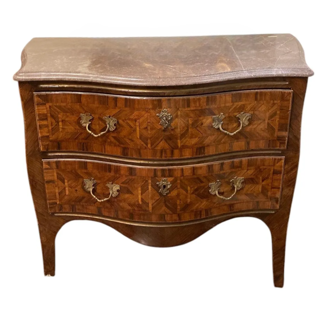Cassettone a due cassetti con maniglie in bronzo e piano in marmo.