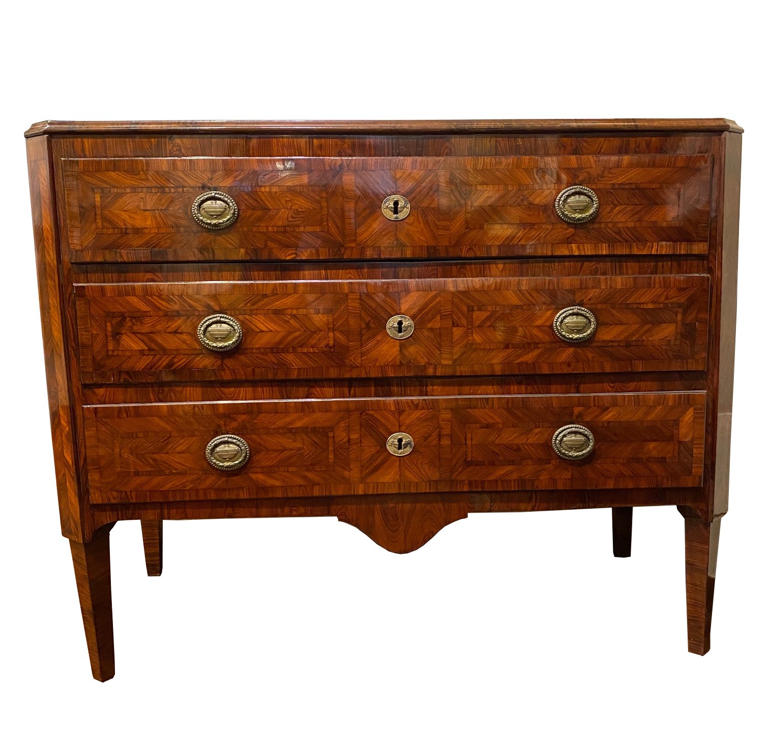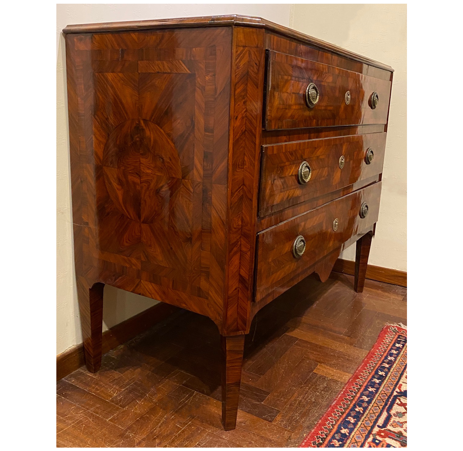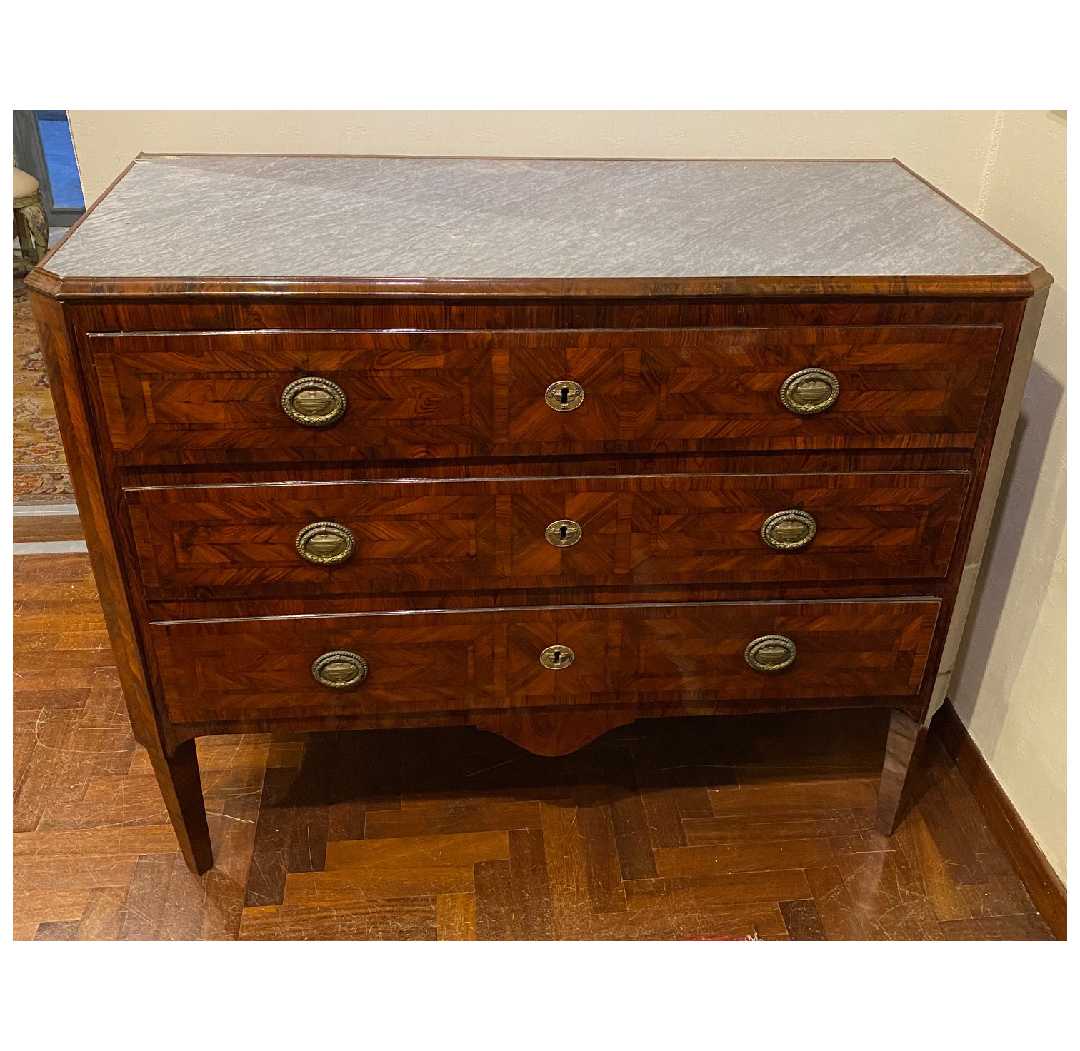 Cassettone Luigi XVI, “lastronato” in ebano viola. Piano in marmo di Billiemi.