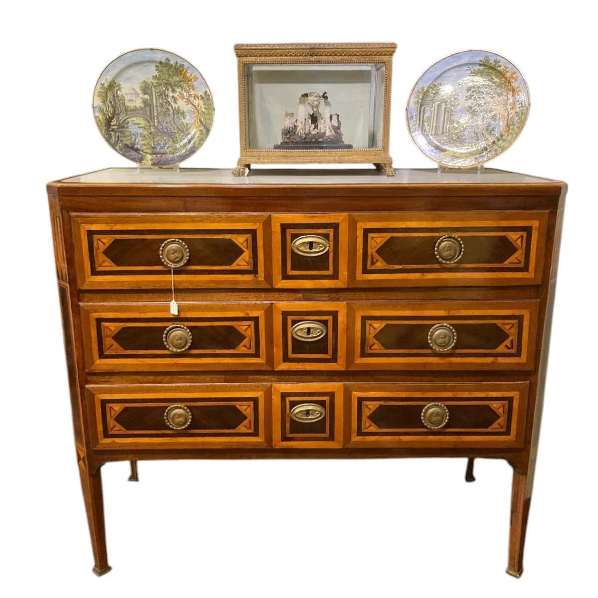 Cassettone a tre cassetti in legni vari con maniglie in bronzo e piano in marmo.