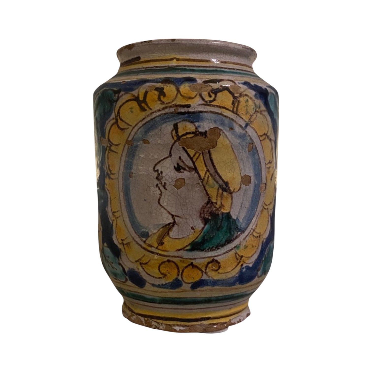 Piccolo cilindro di Caltagirone con rappresentante nel recto un medaglione con ritratto di profilo e nel verso decorazioni a fiori e fogliami su sfondo blu.