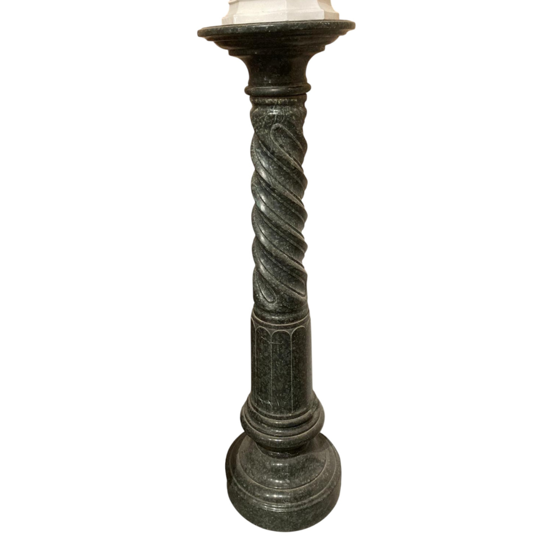 Colonna in marmo grigio con scanalature tortili, base circolare e ripiano circolare.