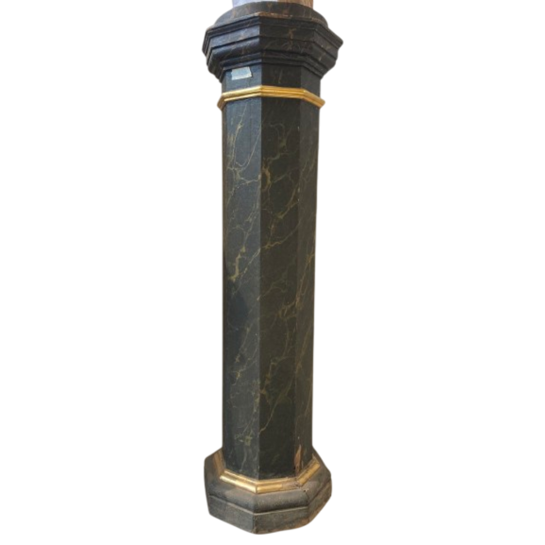 Colonna lignea a base ottagonale decorata ad effetto finto marmo nero con dorature a mecca.