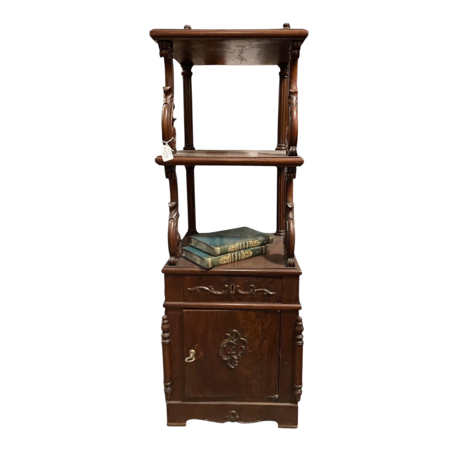 Comodino con anta inferiore e mensole a giorno raccordate da elementi a volute intagliate a fogliami in mogano e piuma di mogano.
