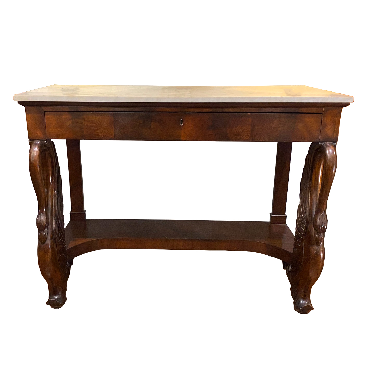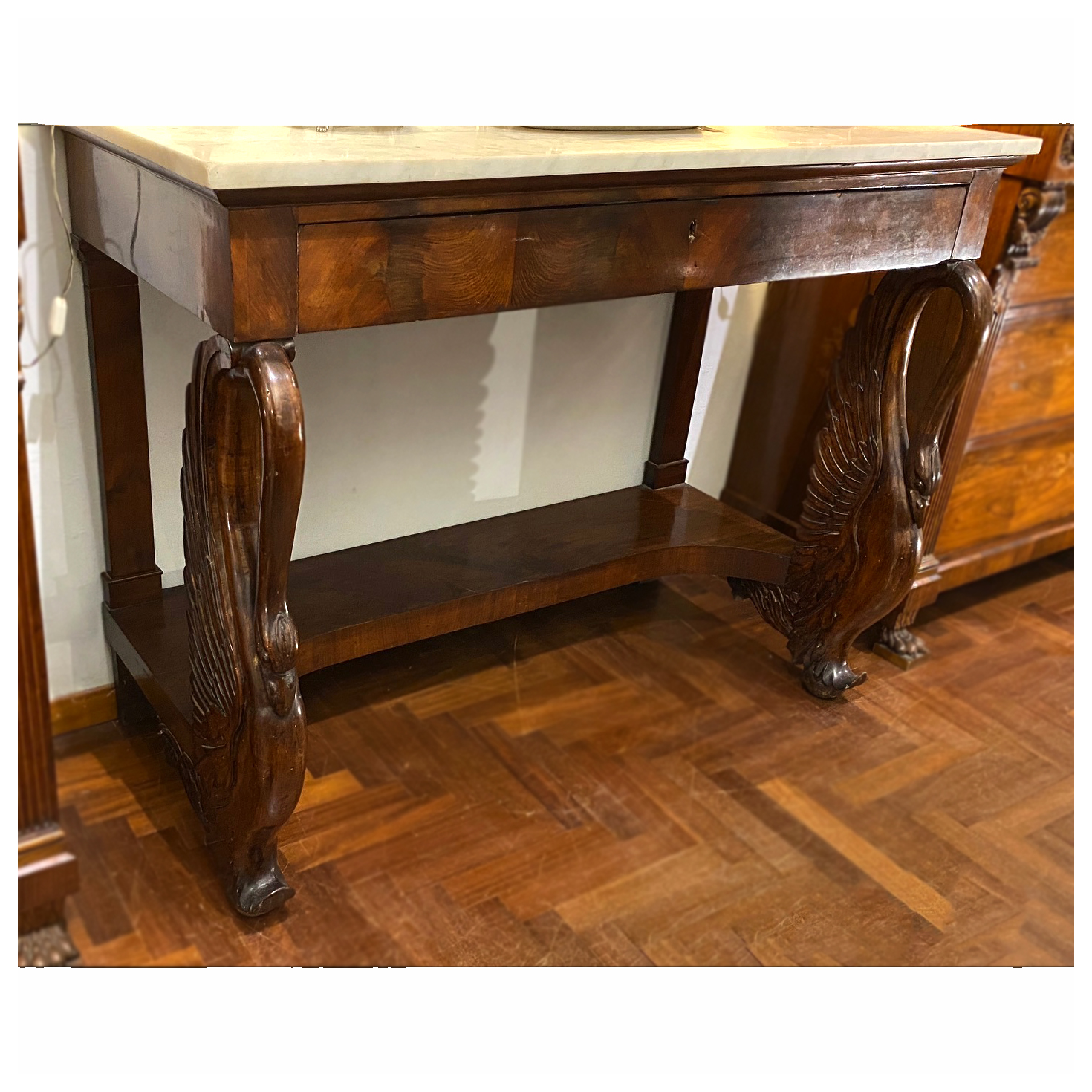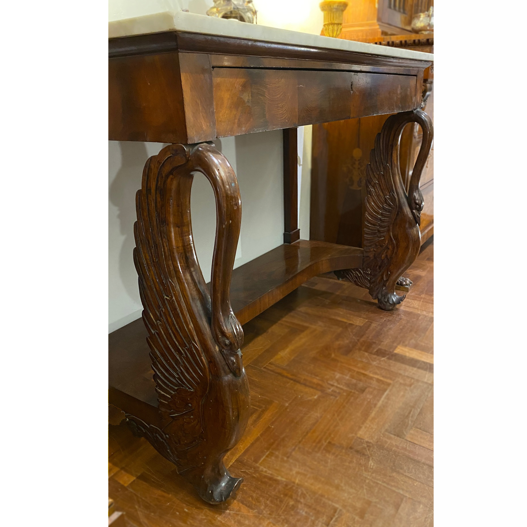 Console in mogano e piuma di mogano con cigni stilizzati, cassetto e piano in marmo bianco.
