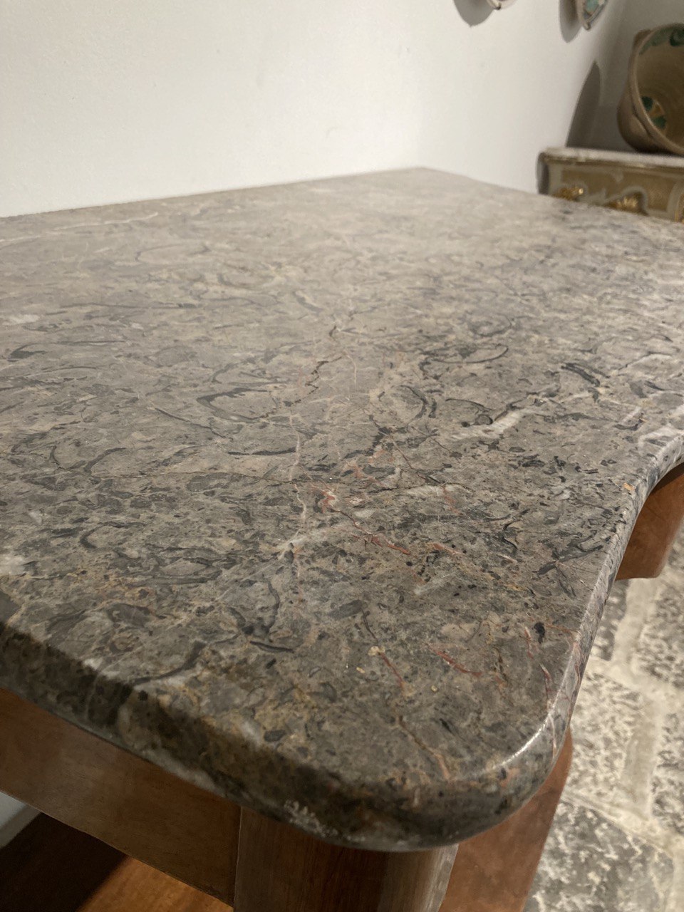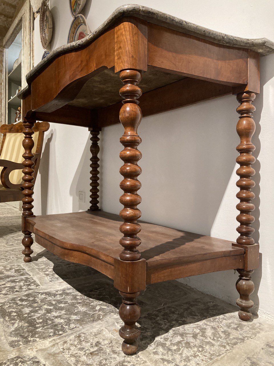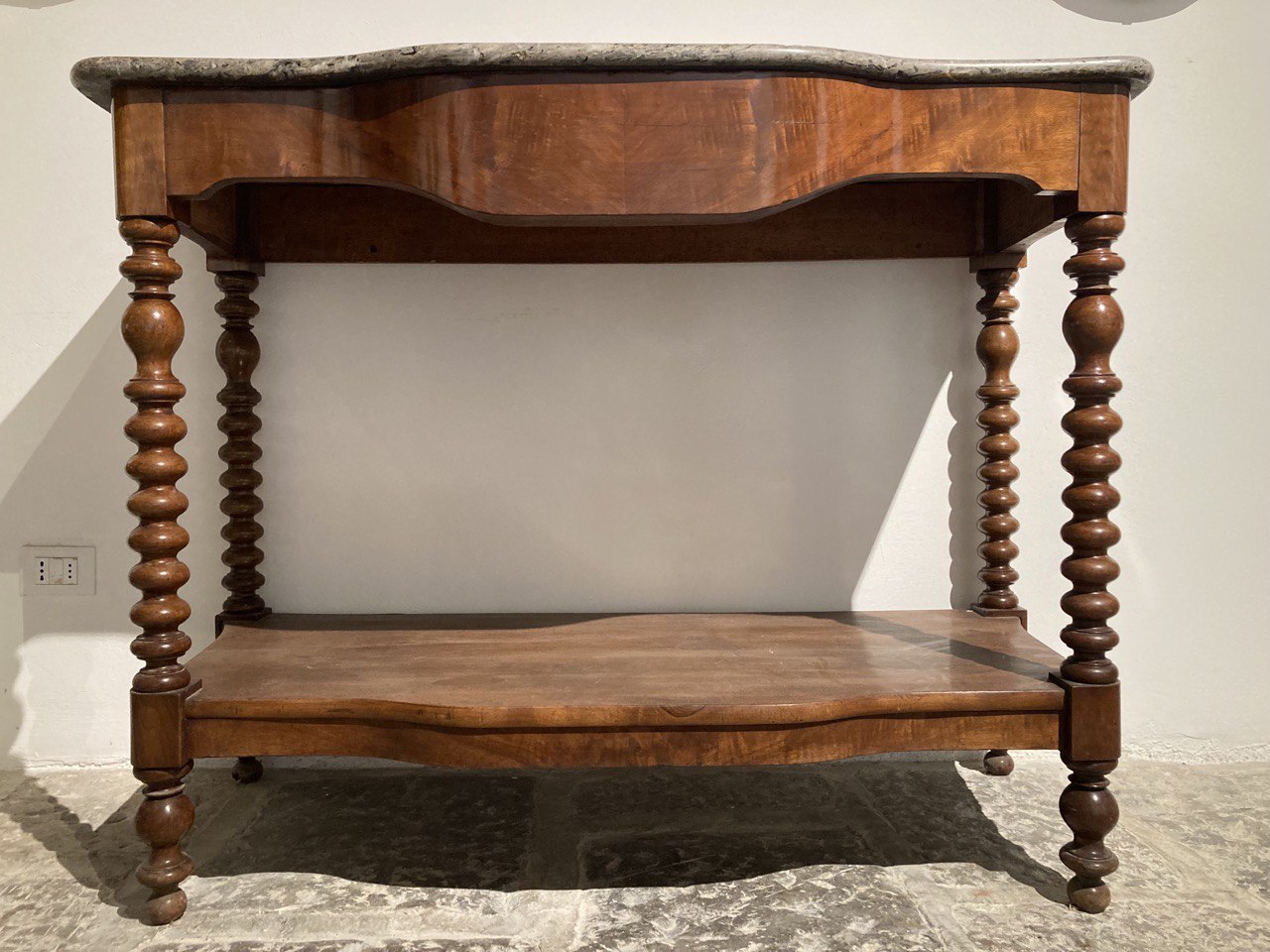 Consolle in legno di noce e piano in marmo grigio sorretto da 4 colonnine.