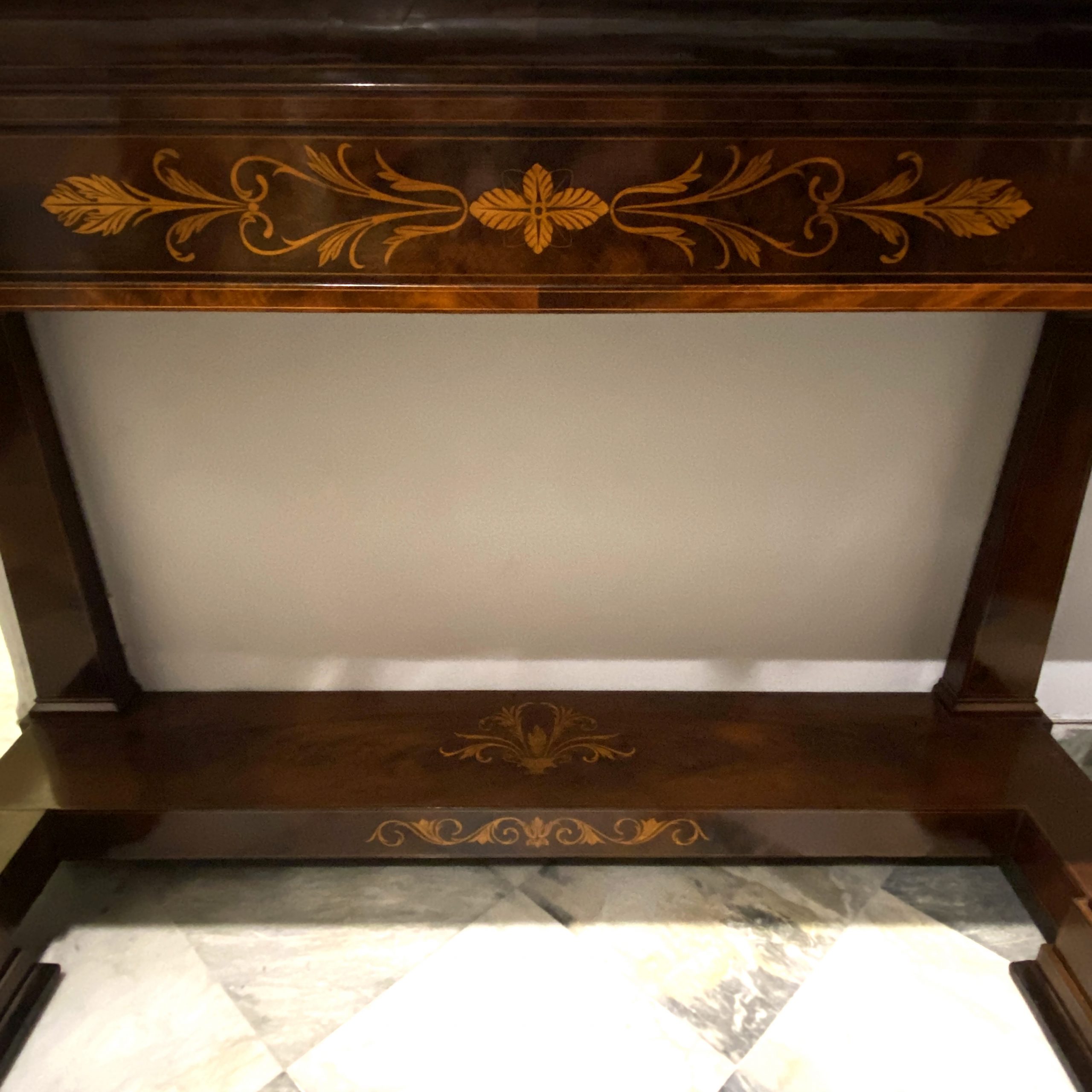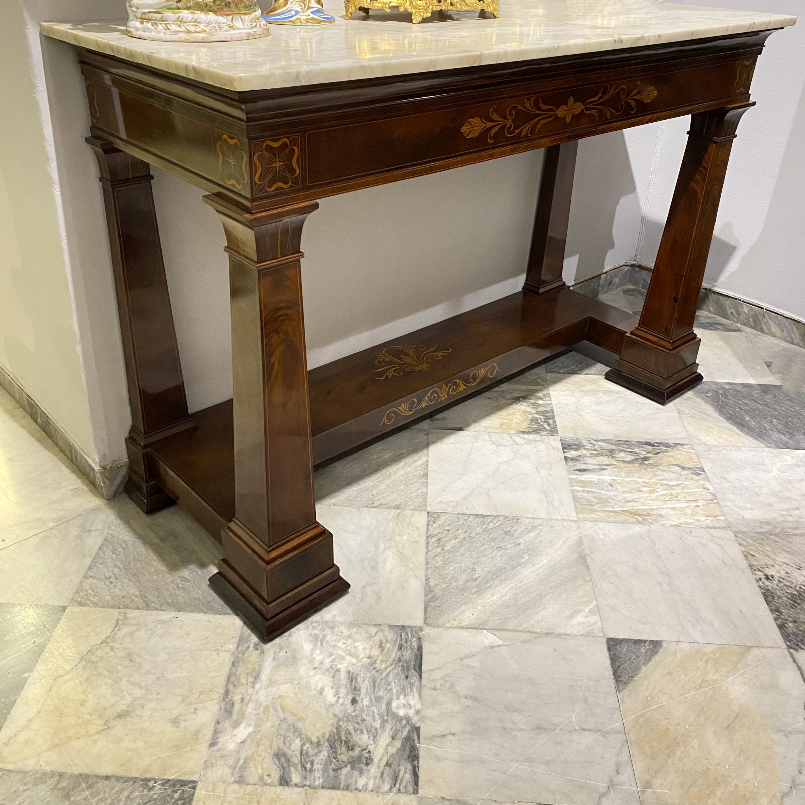Coppia di consolle in mogano con intarsi in bosso e piano in marmo bianco di Carrara.