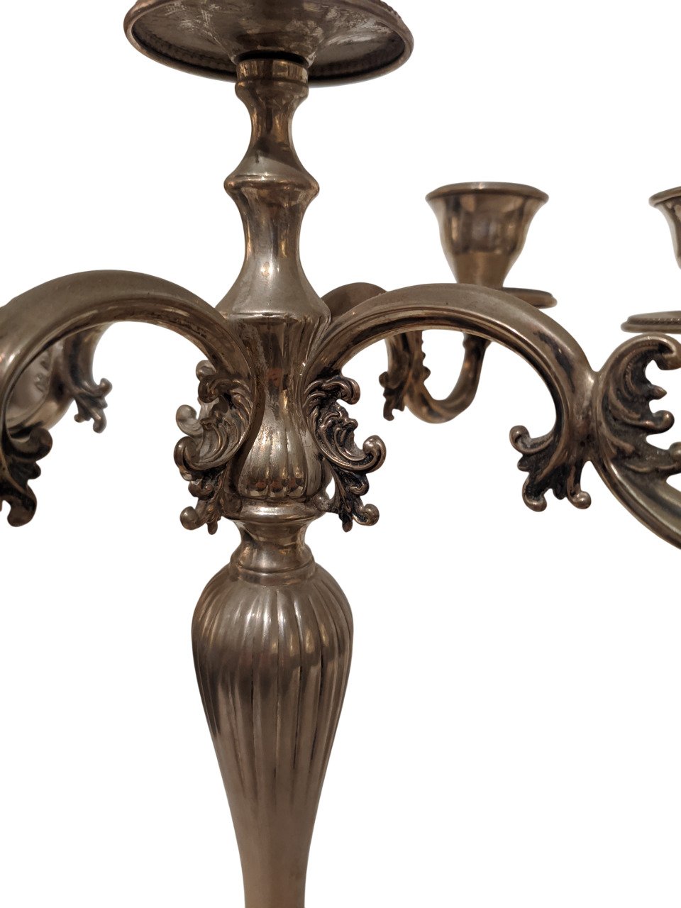 Coppia di Candelabri a cinque bracci finemente cesellati in argento 800 realizzato in Italia nel 1950 ca.