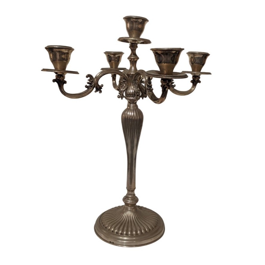 Sono costituiti da una base circolare ampia e decorata con scanalature radiali incise; Il fusto centrale, slanciato e affusolato, presenta una superficie scanalata verticale che aggiunge eleganza e slancio alla struttura. Dalla sommità del fusto si diramano cinque bracci riccamente decorati con riccioli e motivi floreali.