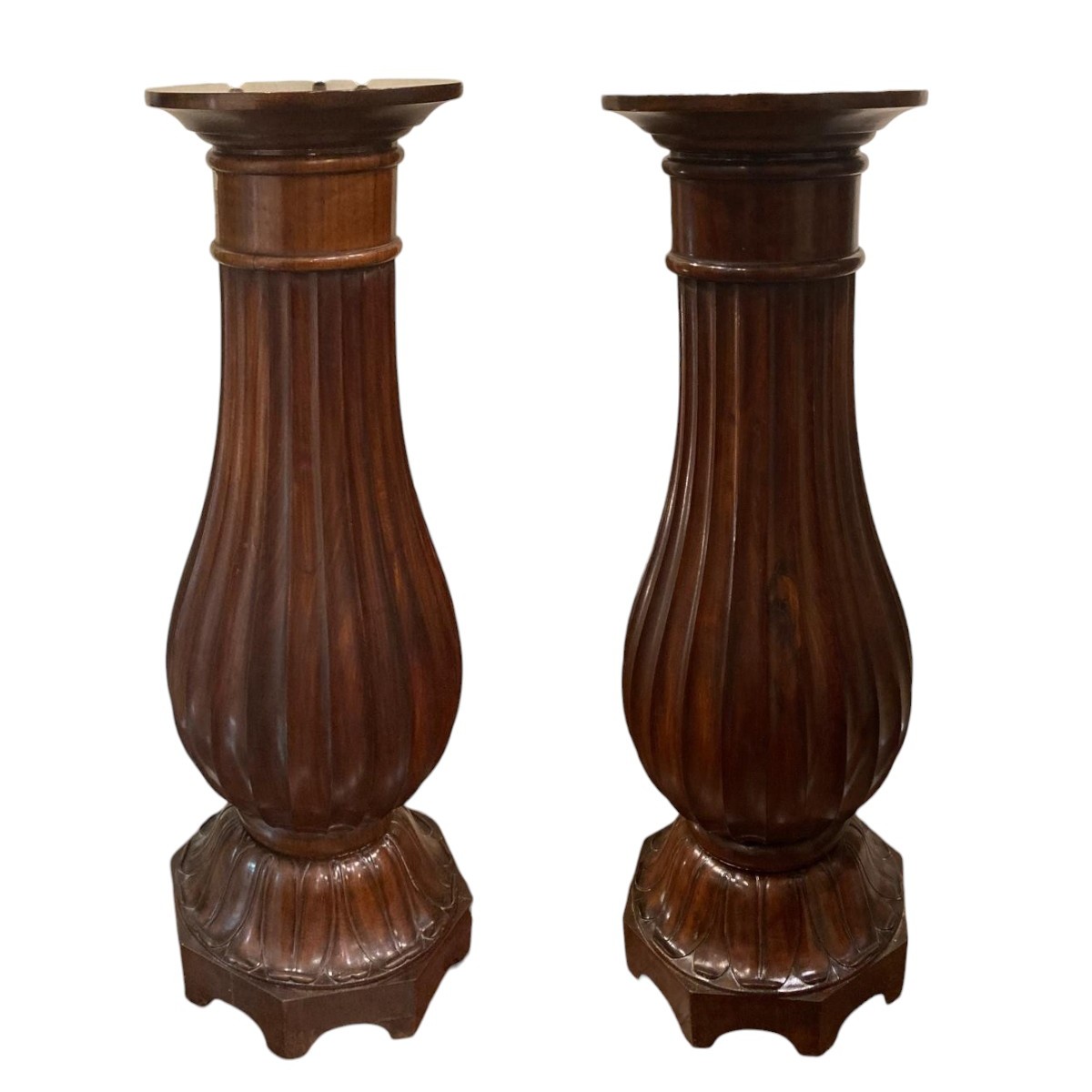 Coppia di guéridon in mogano intagliato a motivi di scanalature e foglia d’acanto.