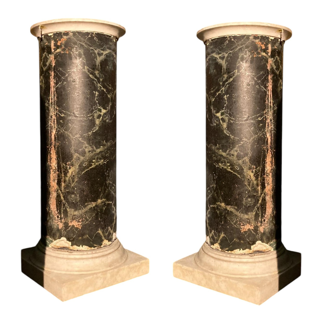 Coppia di colonne in pietra con effetto finto marmo con base quadrata bianca e ripiano circolare.