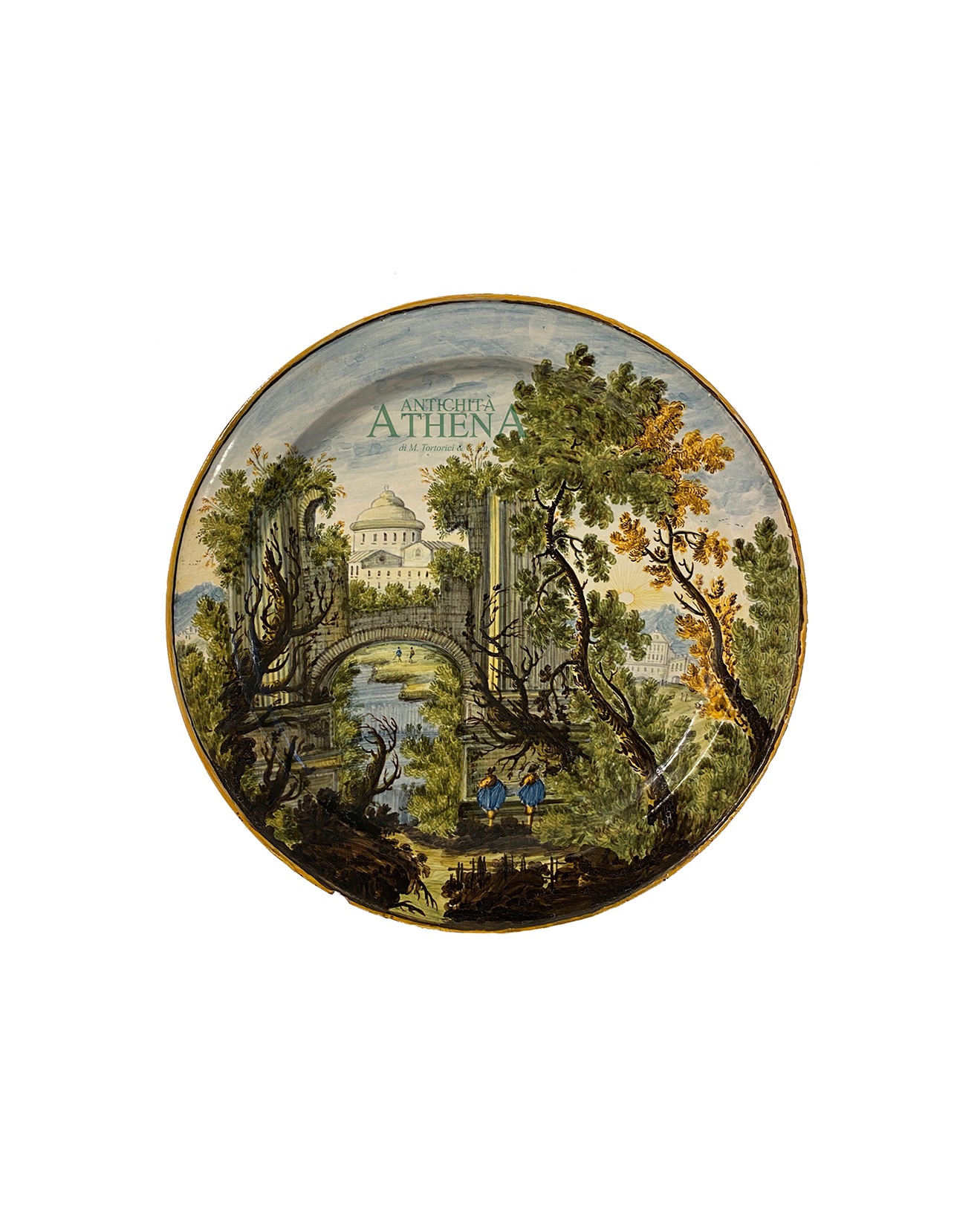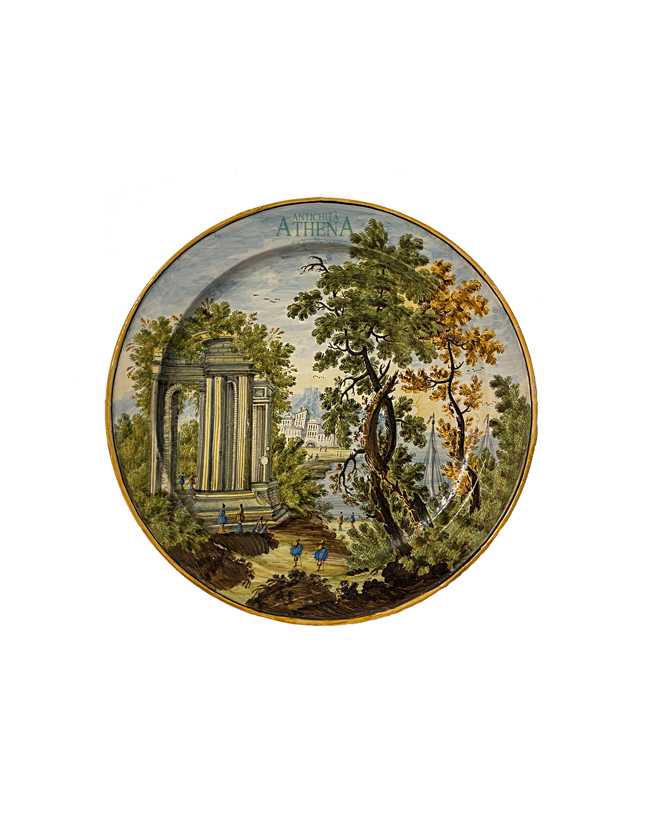 Coppia di piatti in maiolica policroma raffiguranti paesaggi con architettura.
