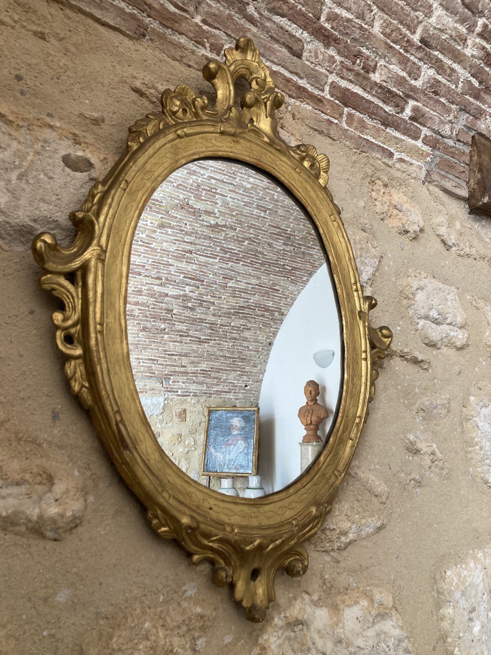 Specchiera di epoca Luigi XVI in legno intagliato e dorato ad oro zecchino a motivi di fogliami e rocailles.
