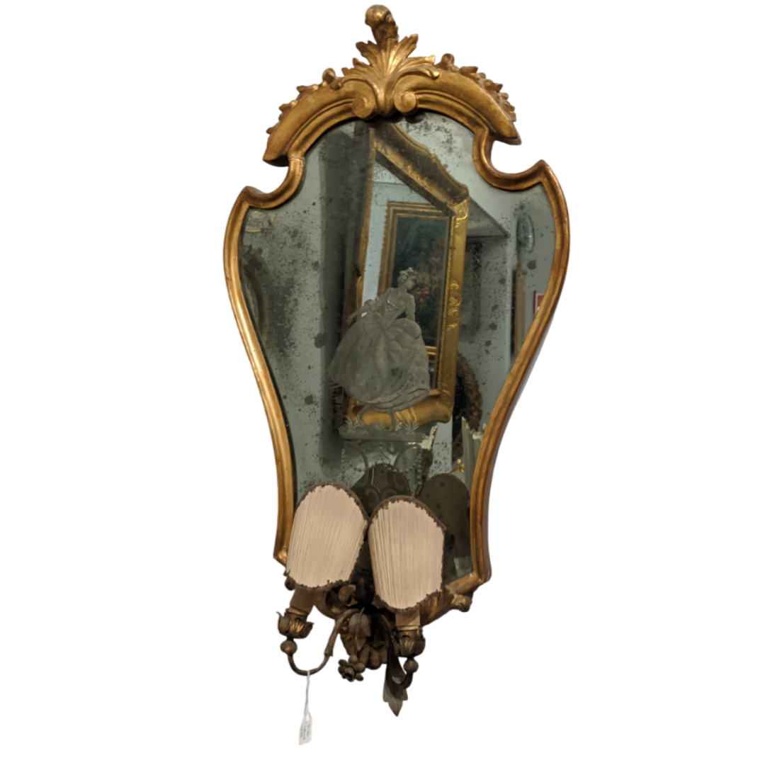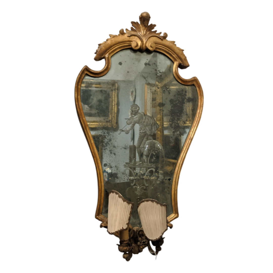 Coppia di Applique a specchio in legno dorato a mecca con decorazione nella parte centrale dello specchio raffigurante donna e musicista.