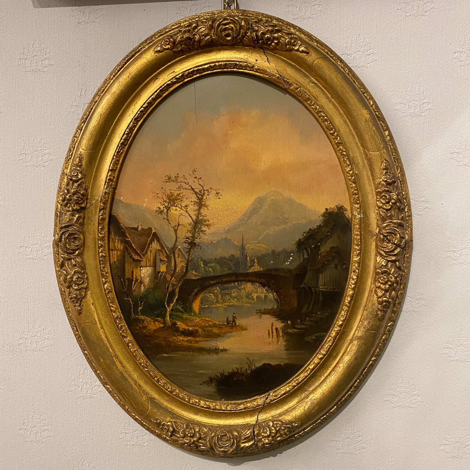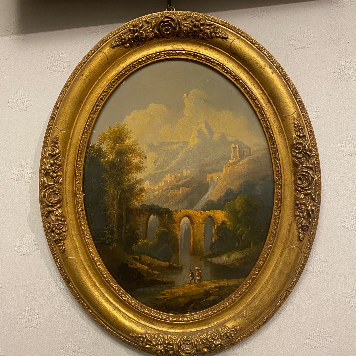 Coppia di dipinti ovali raffiguranti paesaggi fluviali entro cornice dorata e intagliata coeva