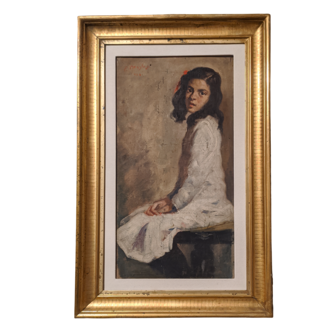 L’opera rappresenta una giovane donna seduta su una panca, con un’espressione intensa e uno sguardo rivolto verso l’osservatore. Il suo viso è delicatamente illuminato, mettendo in evidenza i tratti espressivi e il contrasto tra la pelle chiara e i capelli scuri, mossi e parzialmente trattenuti da un fiocco rosso.