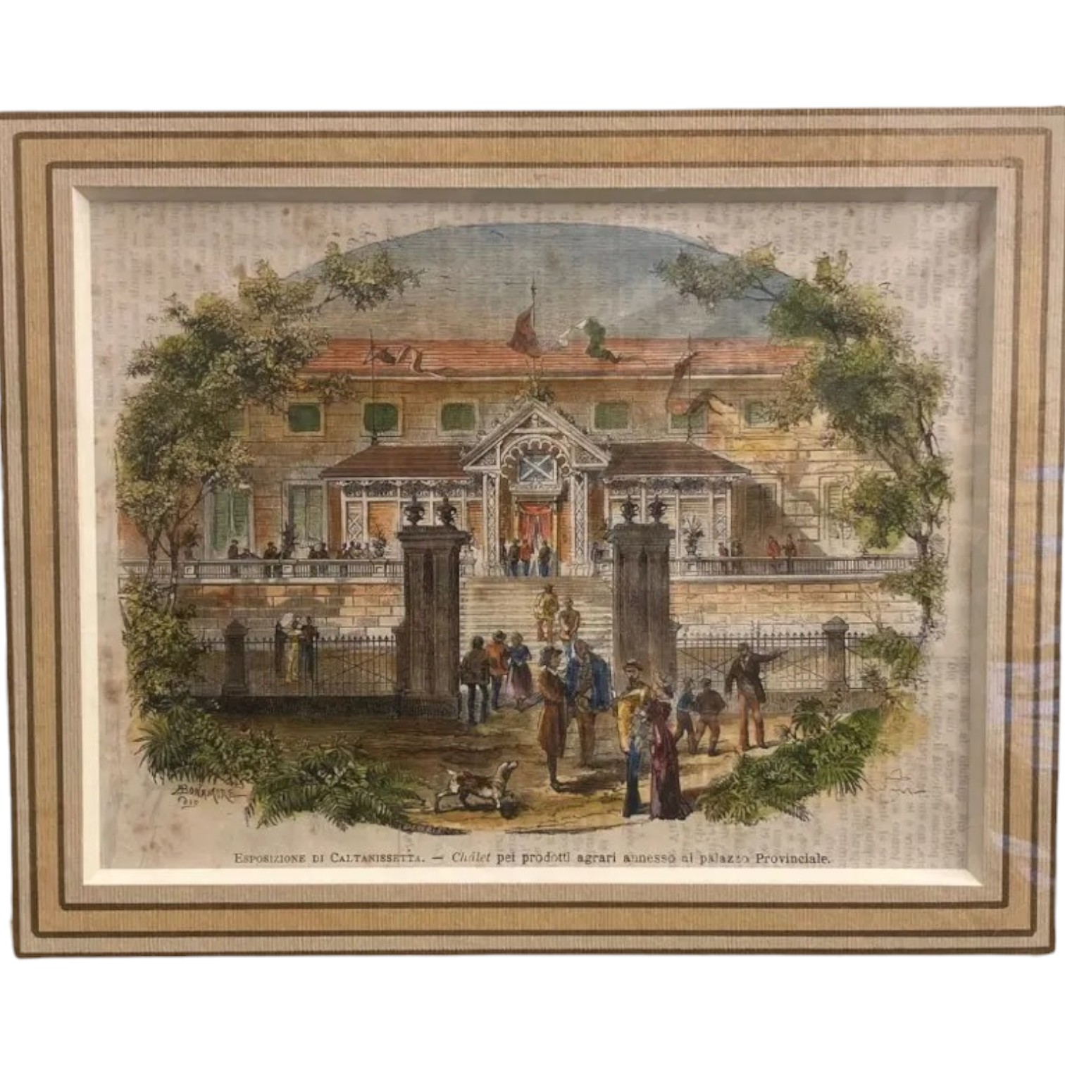 Stampa raffigurante l’esposizione di Caltanissetta, in particolare lo chalet dei prodotti agrari annesso al palazzo Provinciale, realizzata con la tecnica dell’incisione su legno nel 1878 da A. Bonamore.