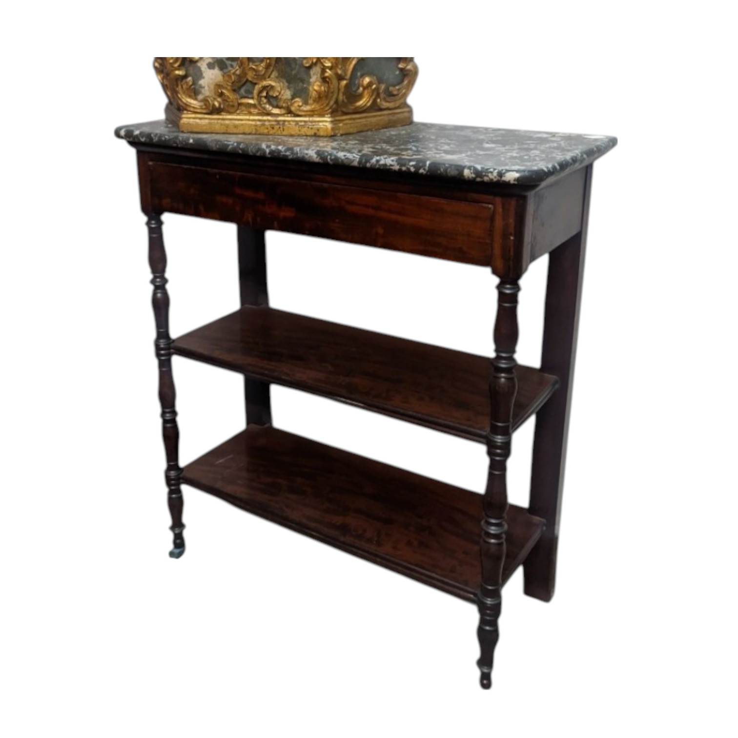 Etagere in mogano a tre ripiano con cassettino e piano in marmo grigio.