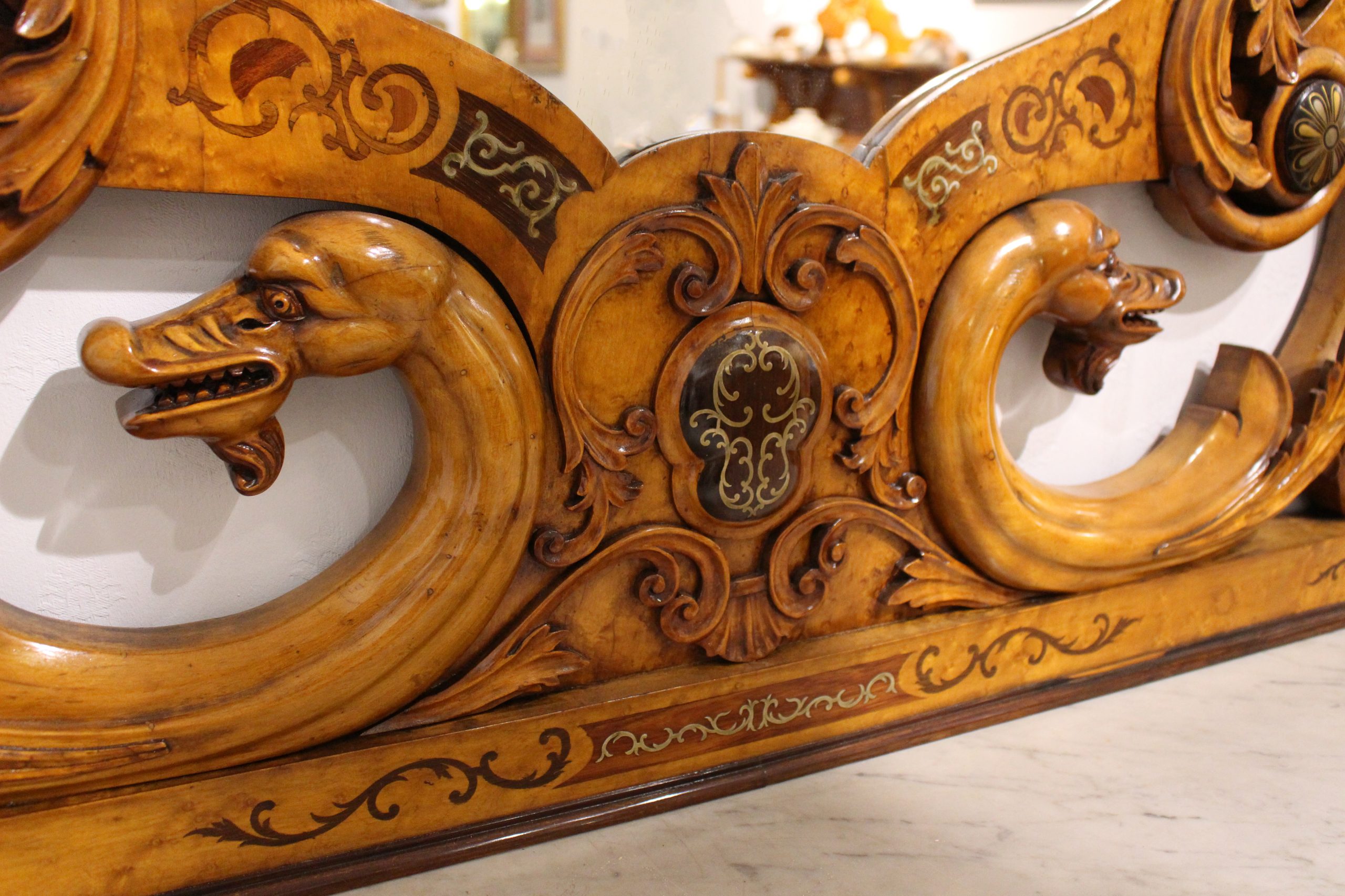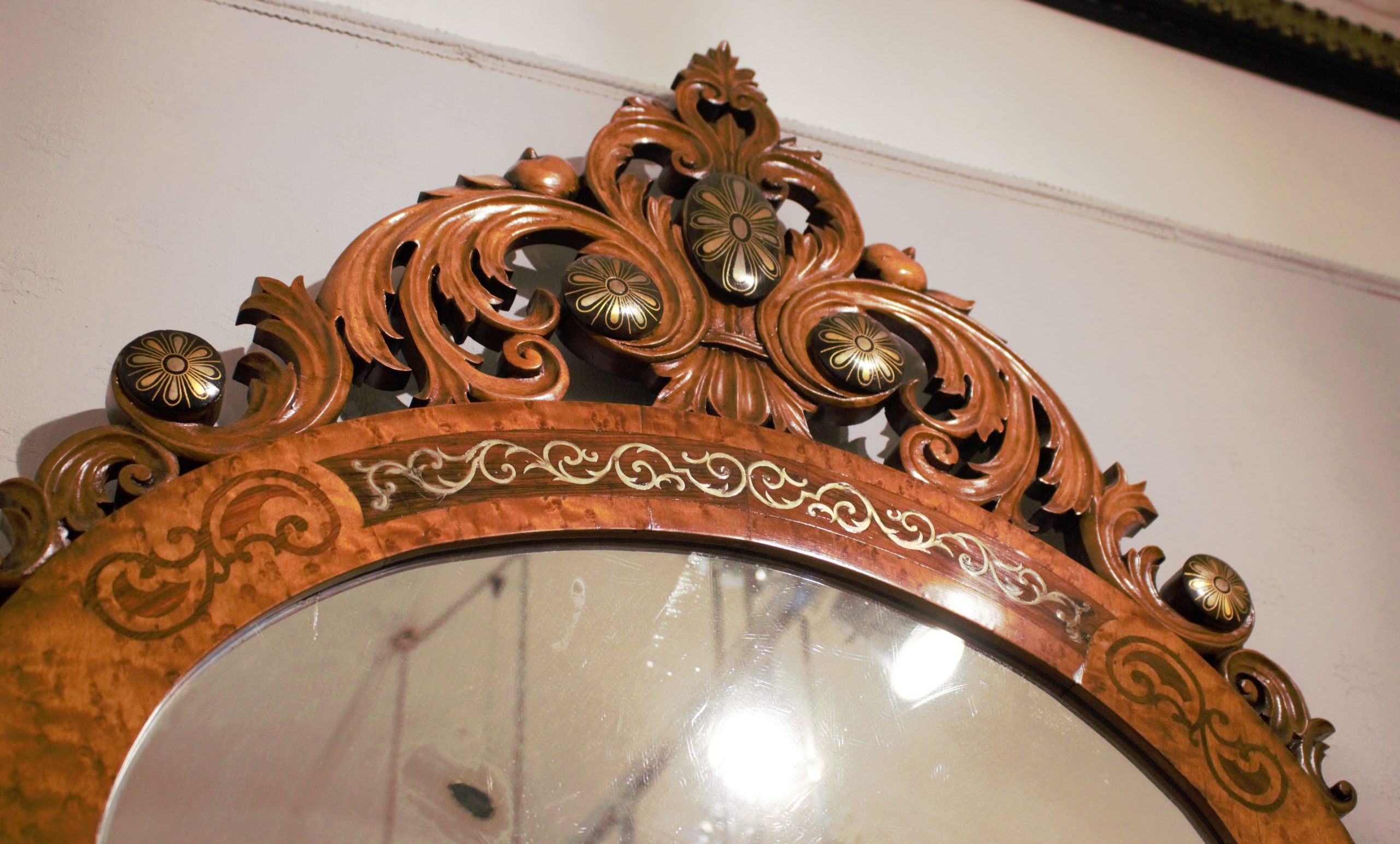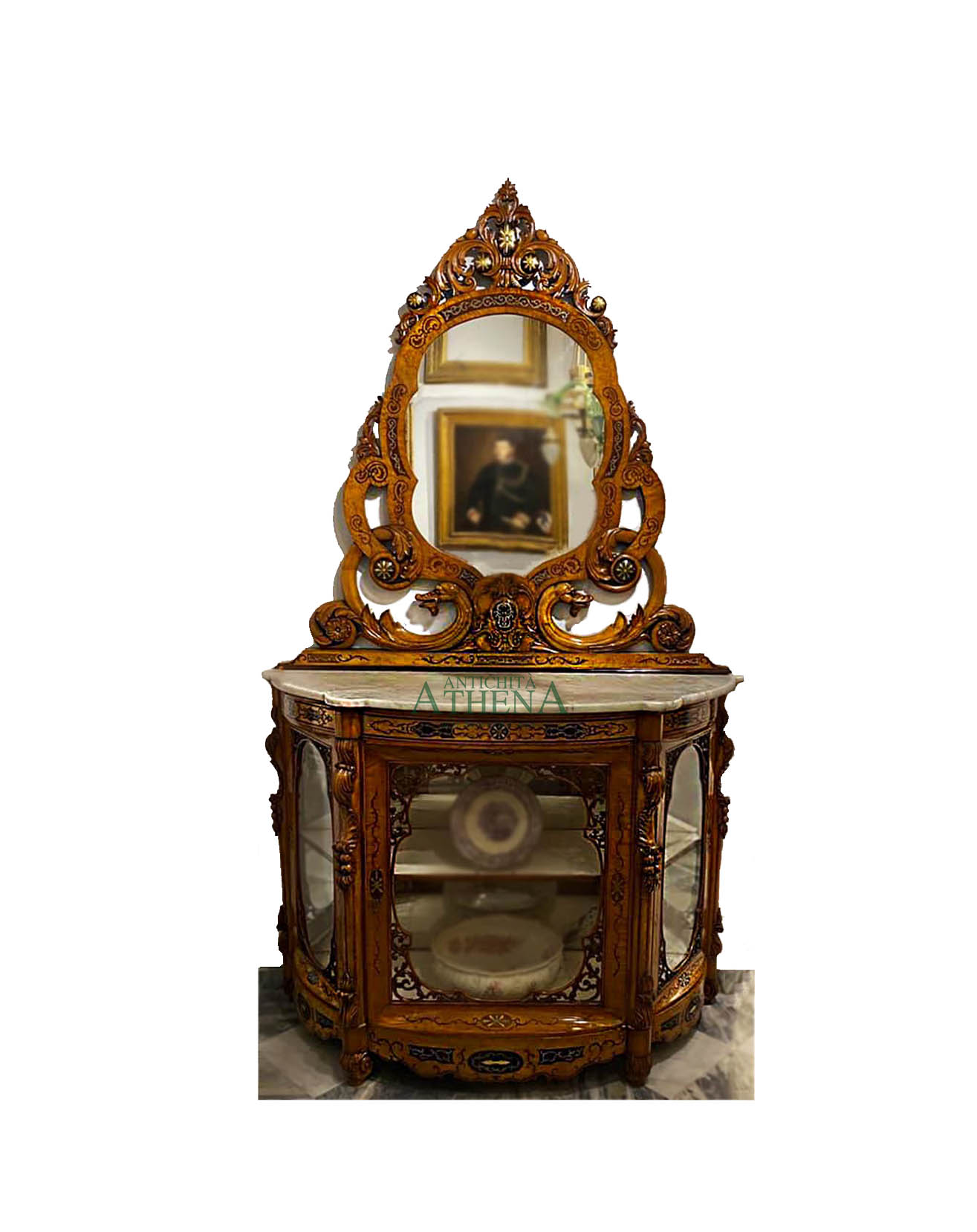Raro etagere con specchiera in acero e radica di acero con intarsi in palissandro e zinco; su parte inferiore, intagli a voluta con specchi.