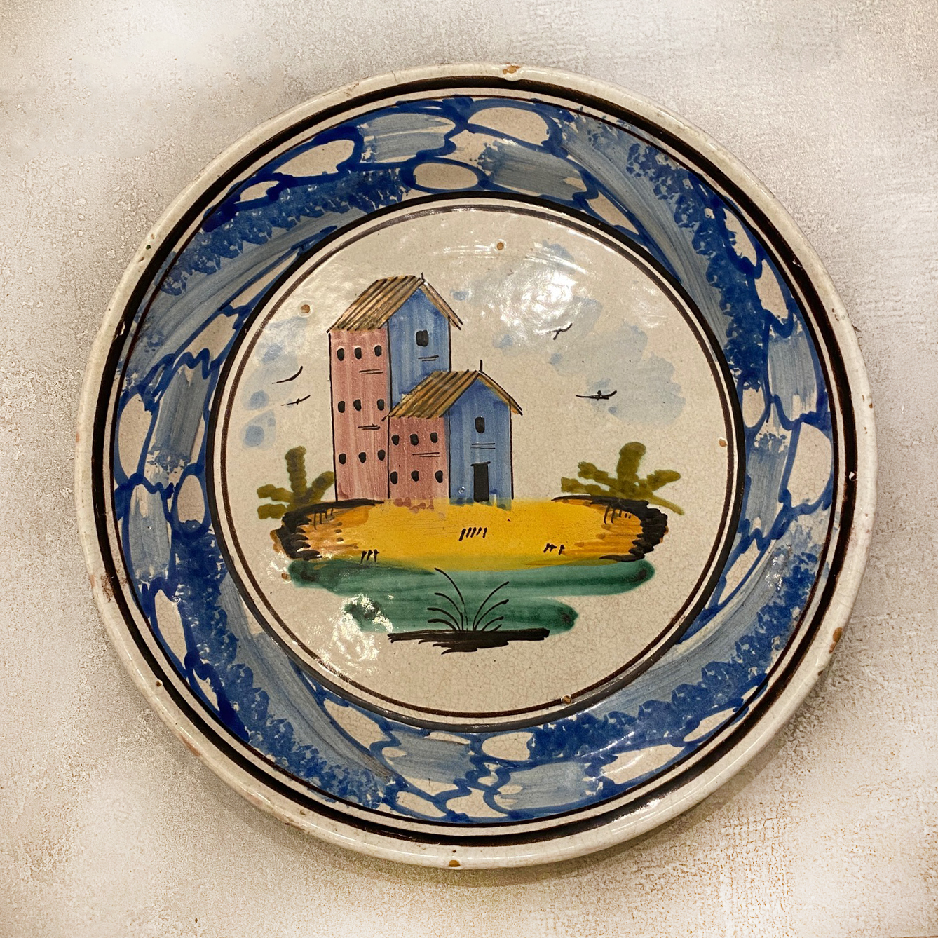Piatto in terracotta con decoro policromo nei toni del giallo, blu e verde su bordo e raffigurazione di case in riva centrale. Stoviglia in uso nelle tavole italiane come piatto da portata.