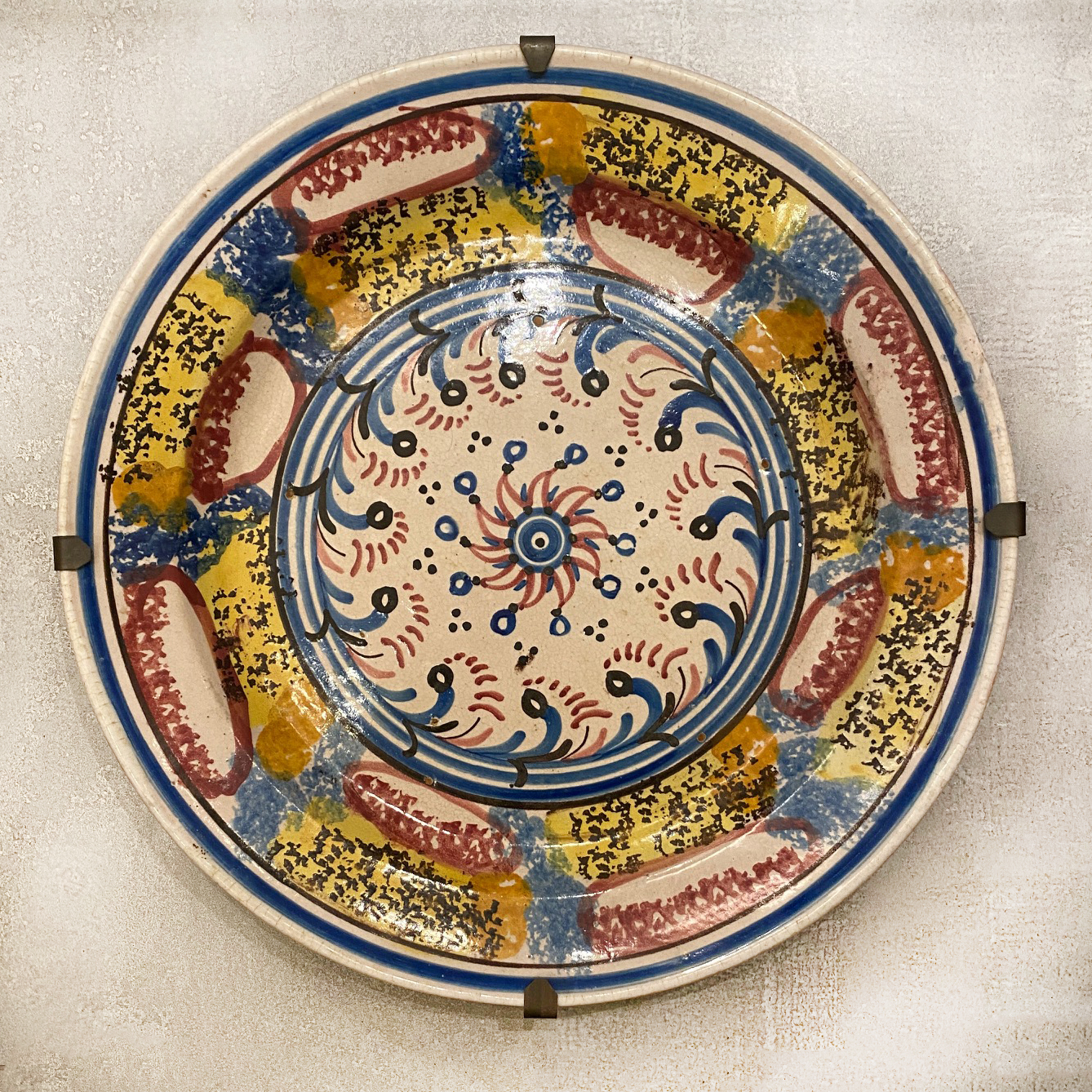 Piatto in terracotta con decoro policromo. Stoviglia in uso nelle tavole italiane come piatto da portata.