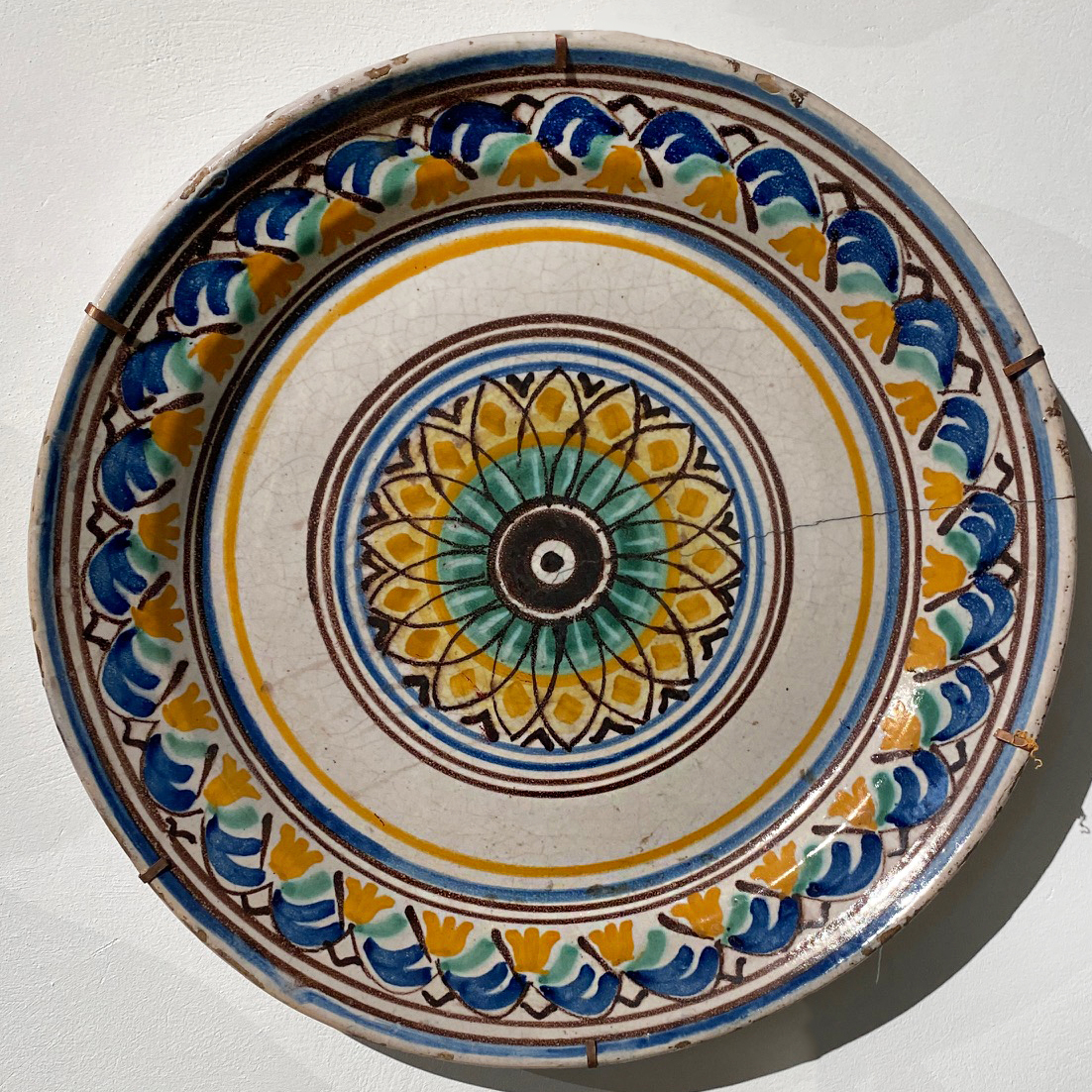 Piatto in terracotta con decoro policromo floreale su bordo e fiore geometrico centrale. Stoviglia in uso nelle tavole italiane come piatto da portata.