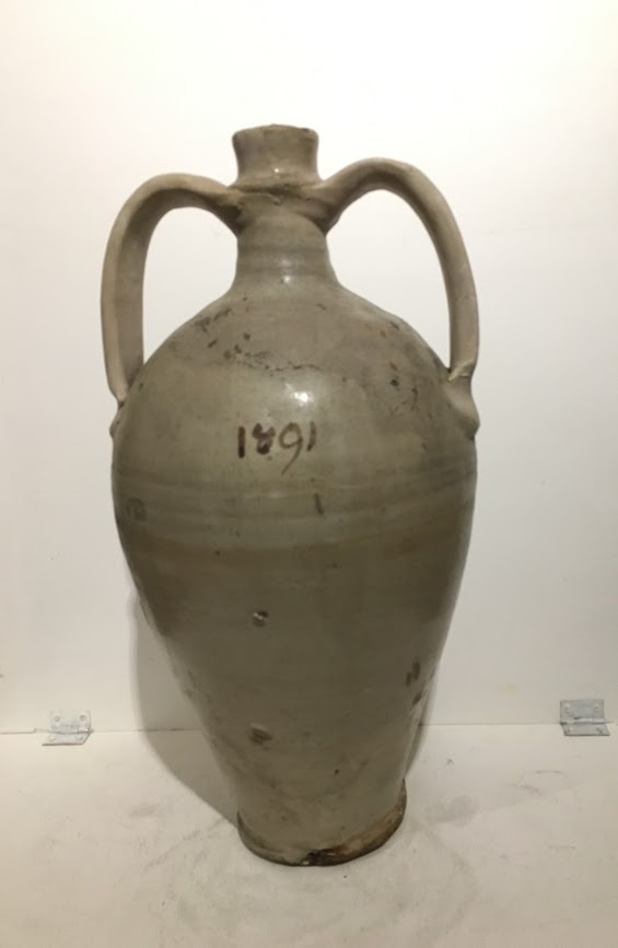 Fiasca in maiolica biansata decorata a motivi floreali e dtata sul verso 1891