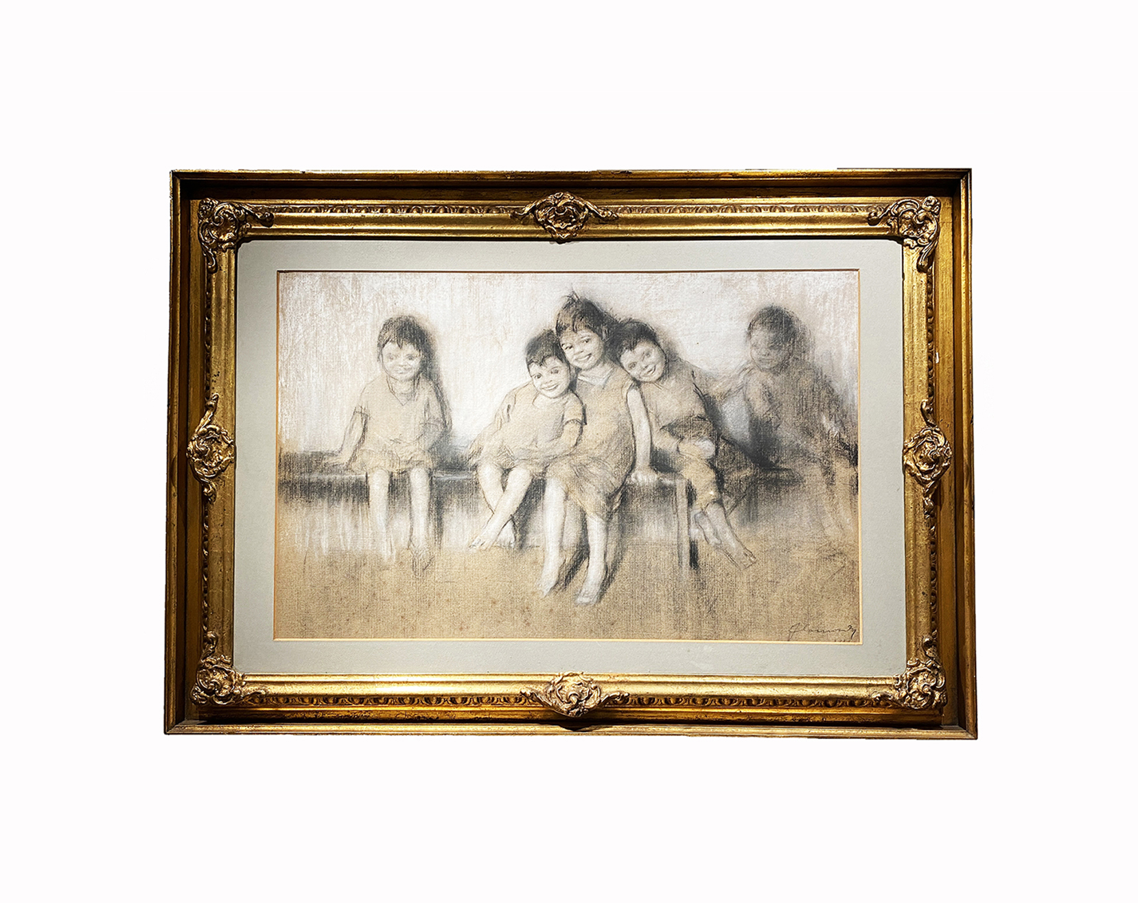 Tecnica mista su cartoncino telato raffigurante cinque bimbi sorridenti.