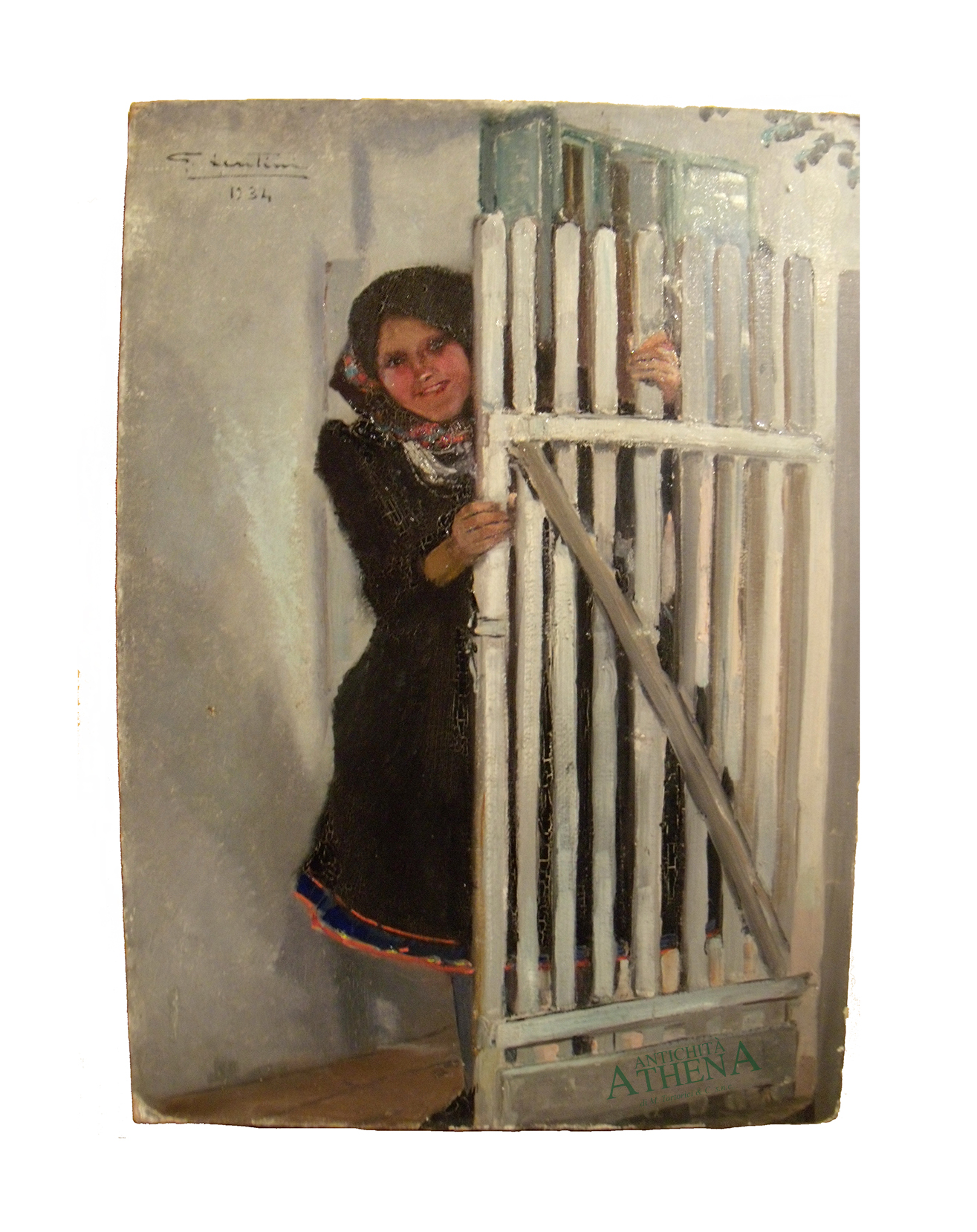 Olio su cartone raffigurante ragazza al cancello datato 1934. Collezione Antichità Athena.