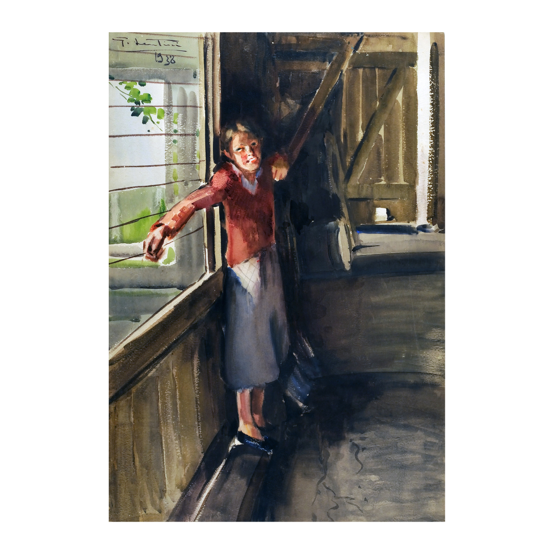 Acquerello raffigurante una giovane ragazza in piedi, colta in un momento di serenità mentre volge lo sguardo verso l’osservatore. La figura si staglia in un ambiente interno avvolto da ombre profonde e toni bruni, illuminata da una luce naturale proveniente da sinistra, dove una finestra lascia intravedere del verde.