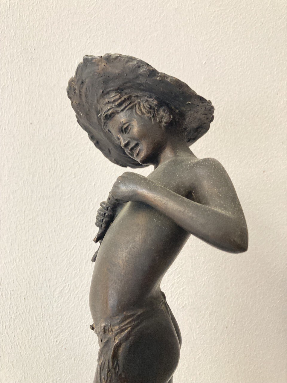 Il giovane pescatore è nudo ad eccezione una specie di perizoma che copre le sue parti intime e gli cinge i fianchi. Indossa un largo cappello che lo ripara dal sole. Il volto è solare e sorridente. Tiene stretto un bel pesce ancora vivo. Il pescatore è in piedi su una roccia. Vicino ai suoi piedi la cesta della pesca e un granchio vivo. Sulla stessa roccia è incisa la firma dell’artista. La scultura si posa su una base in marmo.